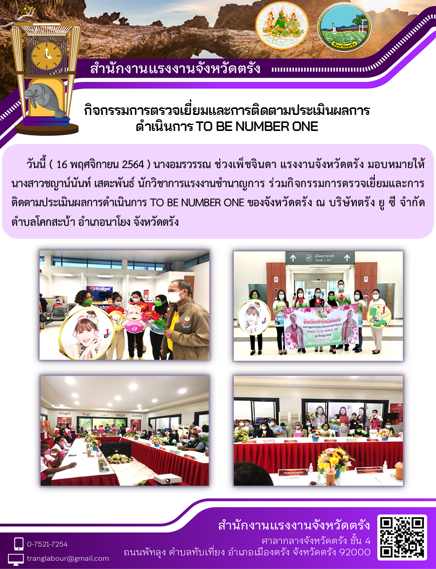 แรงงานจังหวัดตรัง ร่วมกิจกรรมการตรวจเยี่ยมและการติดตามประเมินผลการดำเนินการ TO BE NUMBER ONE ของจังหวัดตรัง ณ บริษัทตรัง ยู ซี จำกัด