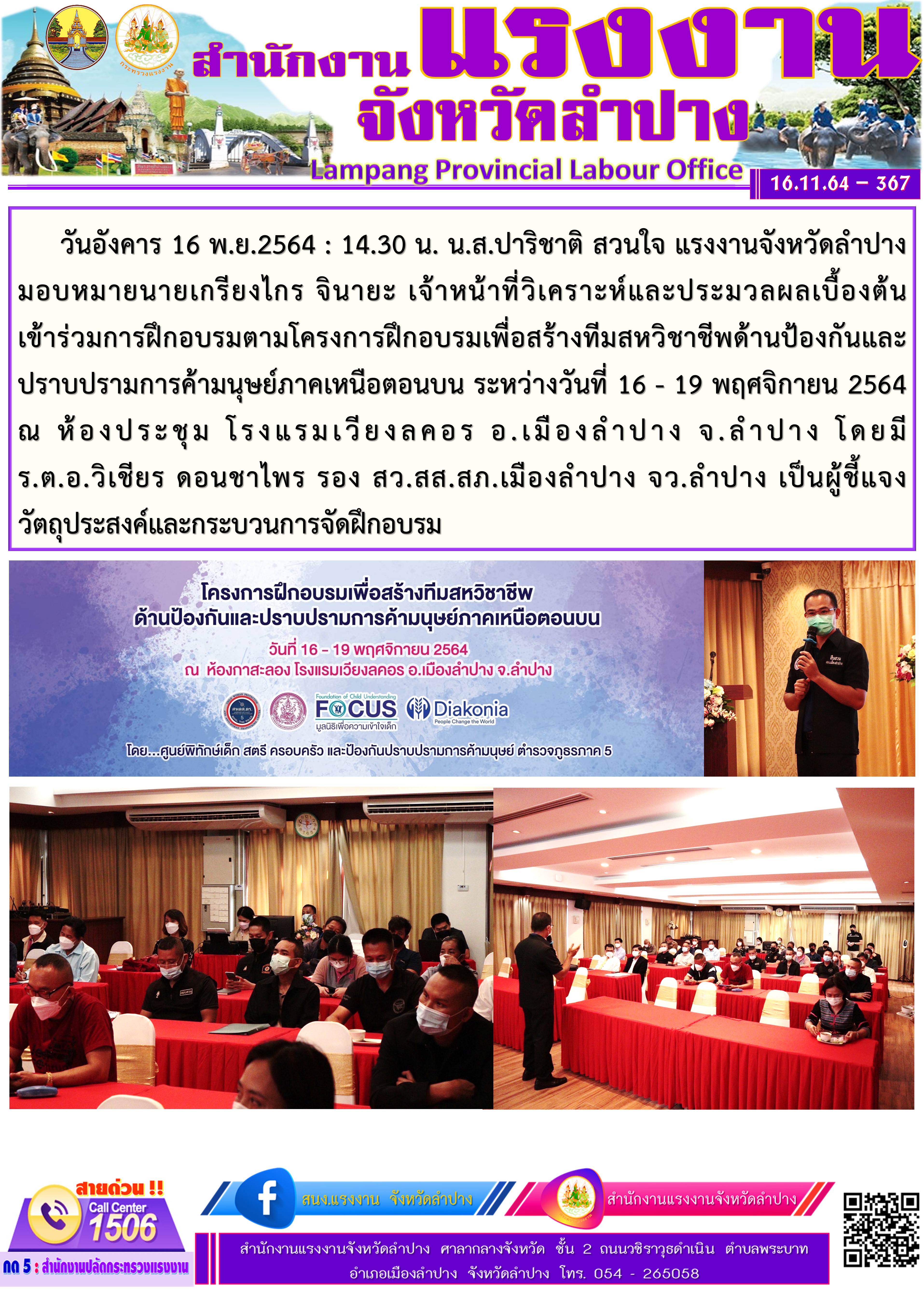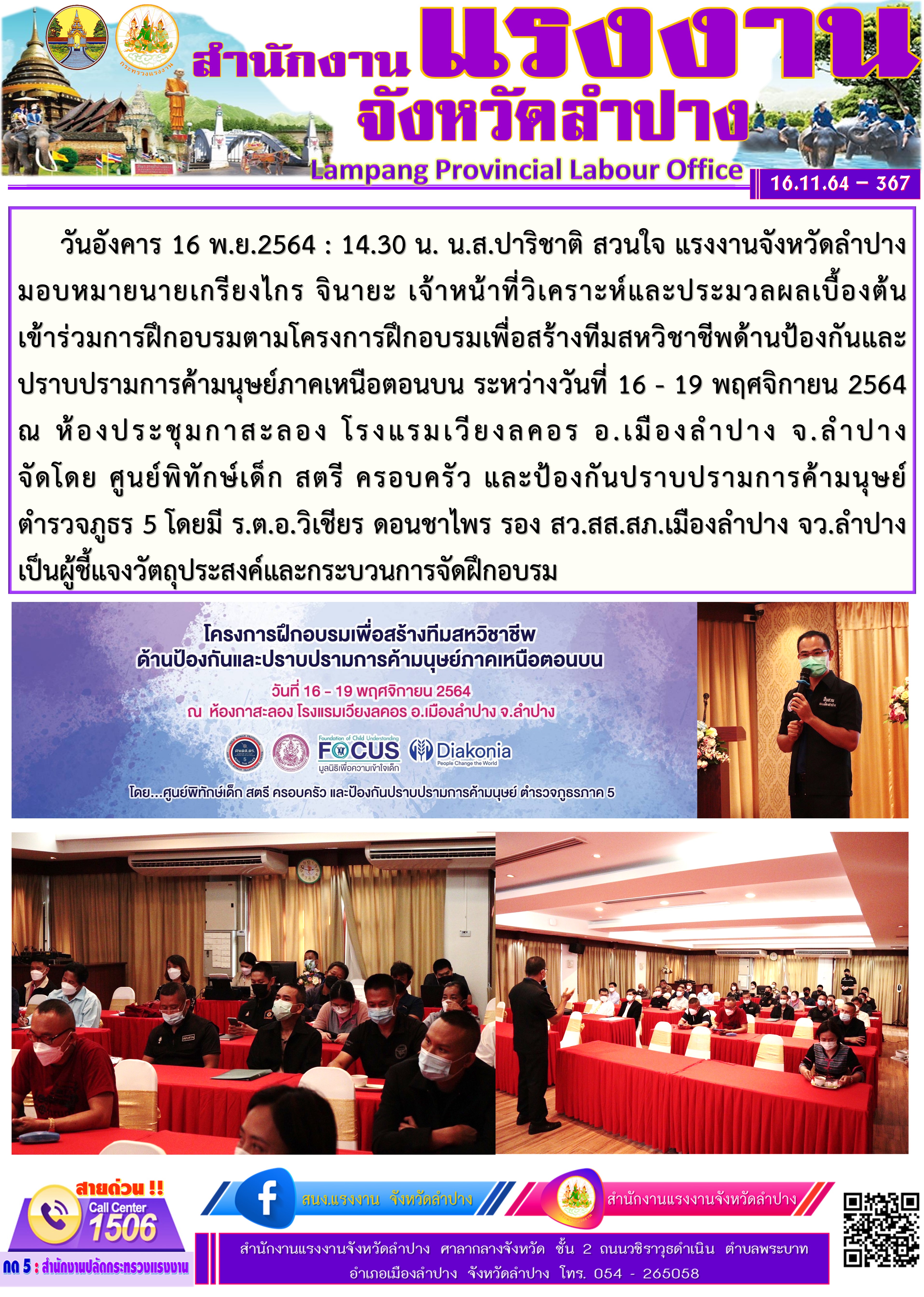 สรจ.ลำปาง ร่วมการฝึกอบรมตามโครงการฝึกอบรมเพื่อสร้างทีมสหวิชาชีพด้านป้องกันและปราบปรามการค้ามนุษย์ภาคเหนือตอนบน