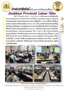แรงงานจังหวัดพระนครศรีอยุธยา ร่วมประชุมสถานประกอบการที่มีลูกจ้าง 1,000 คนขึ้นไป เพื่อชี้แจงแนวทางการสุ่มตรวจคัดกรองเชิงรุก (Active Case Fiding) ในสถานประกอบการขนาดใหญ่ จังหวัดพระนครศรีอยุธยา