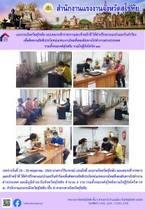 แรงงานจังหวัดสุโขทัย มอบหมายข้าราชการและเจ้าหน้าที่ ให้คำปรึกษาแนะนำและรับคำร้องเพื่อติดตามสิทธิประโยชน์แก่คนงานไทยที่เคยเดินทางไปทำงานต่างประเทศ รวมทั้งรณรงค์สุโขทัย รวมใจสู้ภัยโควิด-19