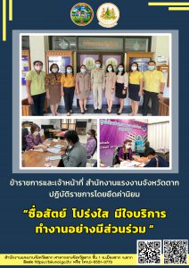 ข้าราชการและเจ้าหน้าที่ สำนักงานแรงงานจังหวัดตาก ปฏิบัติราชการโดยยึดค่านิยม “ซื่อสัตย์ โปร่งใส มีใจบริการ ทำงานอย่างมีส่วนร่วม”
