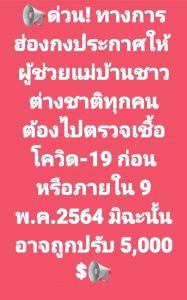 ด่วน! ทางการฮ่องกงประกาศให้ผู้ช่วยแม่บ้านชาวต่างชาติทุกคนต้องไปตรวจหาเชื้อโควิด-19 ก่อนหรือภายในวันที่ 9 พฤษภาคม 2564 มิฉะนั้นอาจมีความผิดตามกฏหมายและถูกปรับเป็นเงิน 5,000 เหรียญฮ่องกง