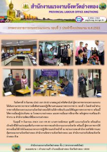 นายสมบูรณ์ ตรัยศิลานันท์ ผู้ตรวจราชการกระทรวงแรงงาน ติดตามการตรวจราชกระทรวงแรงงาน รอบที่ 3 ประจำปีงบประมาณ พ.ศ. 2563 ณ สำนักงานสวัสดิการและคุ้มครองแรงงานจังหวัดอ่างทอง