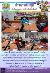 นางชลอศรี บุญแก้วสุข แรงงานจังหวัดปราจีนบุรี ประชุมสำนักงานฯ เพื่อรับมอบนโยบาย แนวทางการปฏิบัติงาน รวมถึงแผนการปฏิบัติงาน และติดตามผลการดำเนินงานของสำนักงานแรงงานจังหวัดปราจีนบุรี