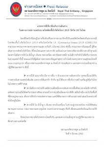 สถานเอกอัครราชทูต ณ สิงคโปร์ เผยแพร่มาตรการที่เกี่ยวข้องกับการเดินทางในสถานการณ์การแพร่ระบาดโรคติดเชื้อไวรัสโคโรนา 2019 (โควิด 19) ในไทย