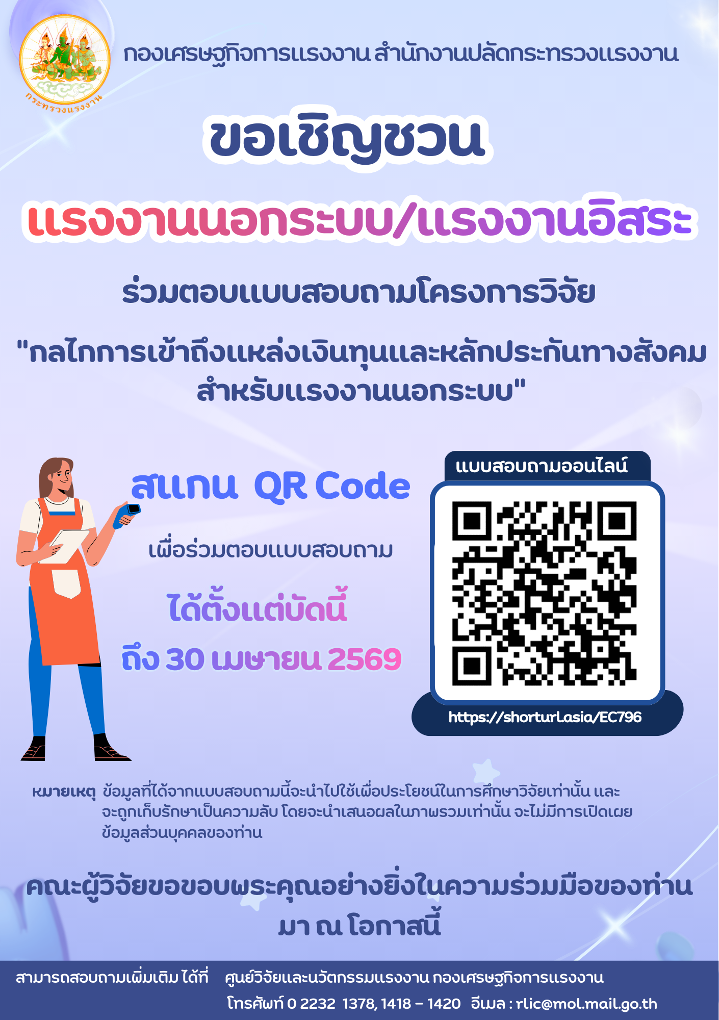 สรจ.ระนองขอเชิญชวนแรงงานนอกระบบ/แรงงานอิสระ ร่วมตอบแบบสอบถามโครงการวิจัย “กลไกการเข้าถึงแหล่งเงินทุนและหลักประกันทางสังคมสำหรับแรงงานนอกระบบ” สามารถสแกน QR Code เพื่อร่วมตอบแบบสอบถาม ได้ตั้งแต่บัดนี้ ถึง 30 เมษายน 2569