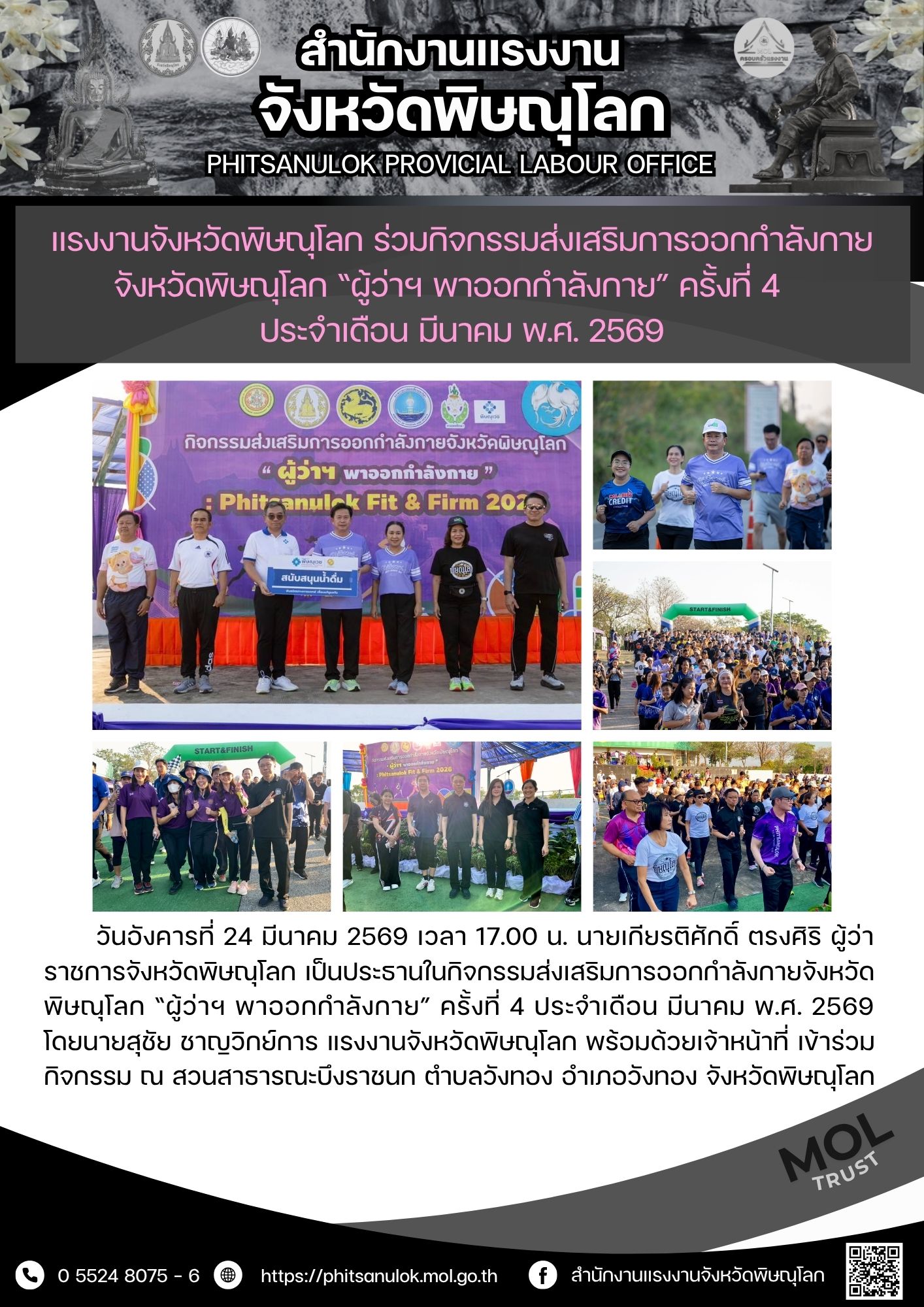 แรงงานจังหวัดพิษณุโลก ร่วมกิจกรรมส่งเสริมการออกกำลังกายจังหวัดพิษณุโลก “ผู้ว่าฯ พาออกกำลังกาย” ครั้งที่ 4 ประจำเดือน มีนาคม พ.ศ. 2569