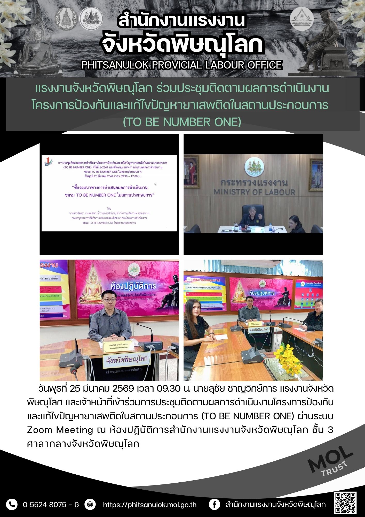 แรงงานจังหวัดพิษณุโลก ร่วมประชุมติดตามผลการดำเนินงาน โครงการป้องกันและแก้ไขปัญหายาเสพติดในสถานประกอบการ (TO BE NUMBER ONE)