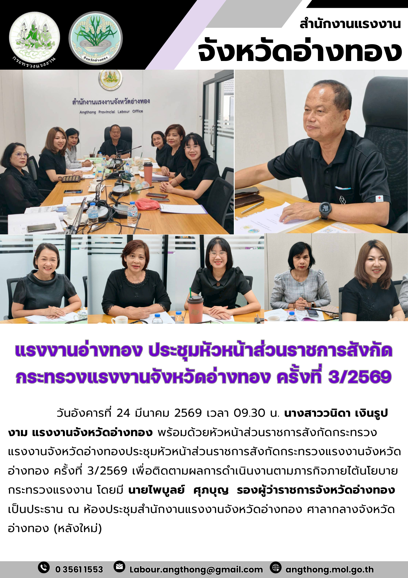 แรงงานอ่างทอง ประชุมหัวหน้าส่วนราชการสังกัด กระทรวงแรงงานจังหวัดอ่างทอง ครั้งที่ 3/2569