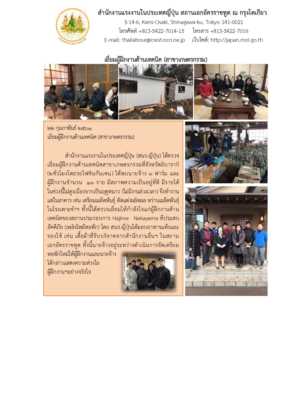 สำนักงานแรงงานในประเทศญี่ปุ่น เยี่ยมผู้ฝึกงานด้านเทคนิค (สาขาเกษตรกรรม)