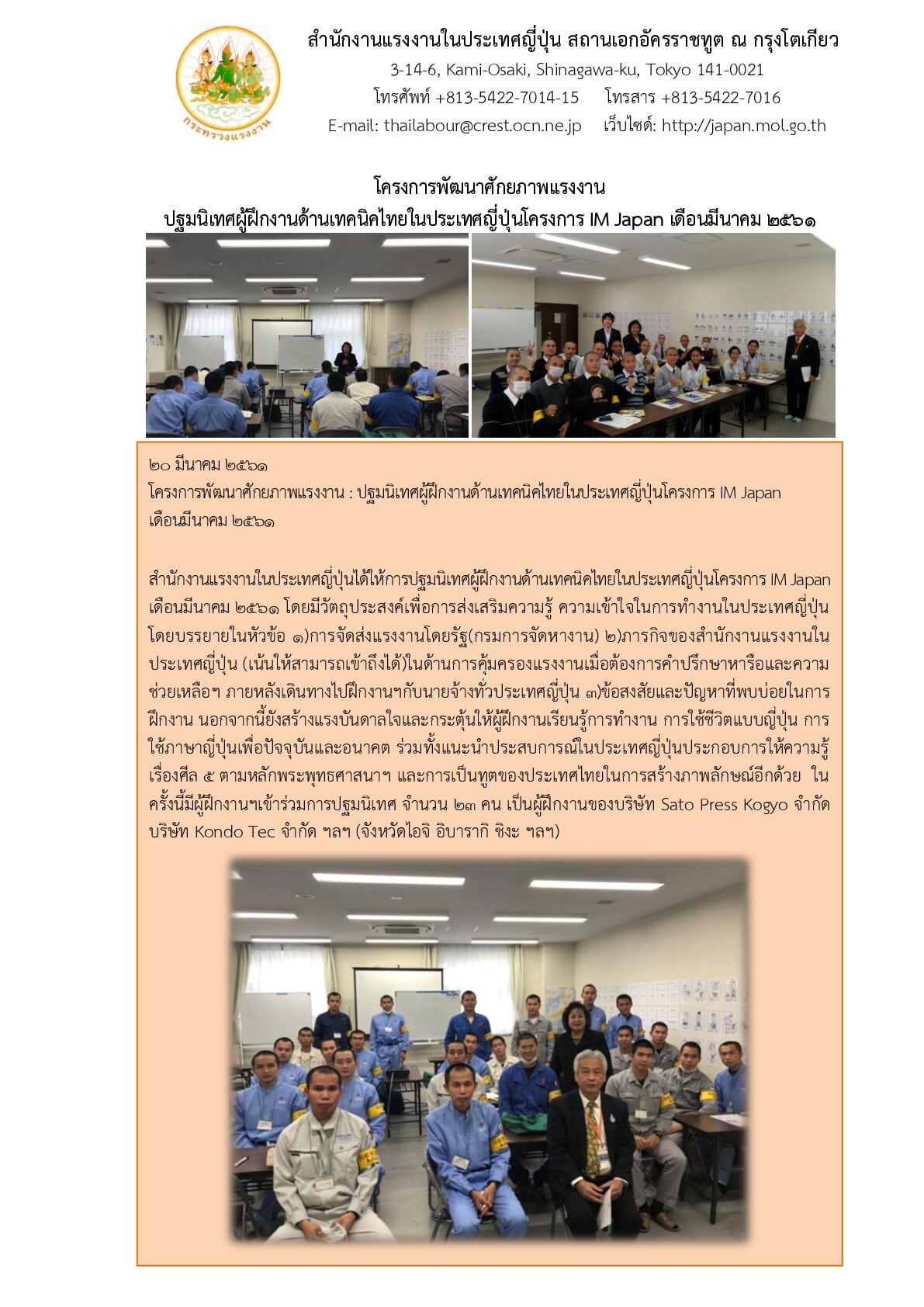 สำนักงานแรงงานในประเทศญี่ปุ่นได้ให้การปฐมนิเทศผู้ฝึกงานด้านเทคนิคไทยในประเทศญี่ปุ่นโครงการ IM Japan เดือนมีนาคม 2561