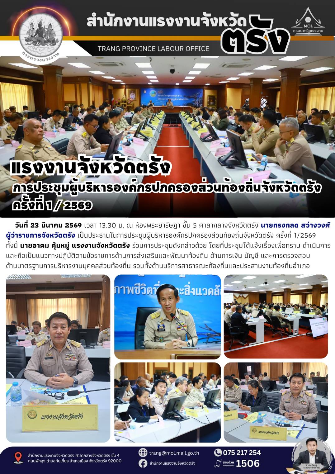 แรงงานจังหวัดตรัง ร่วมการประชุมผู้บริหารองค์กรปกครองส่วนท้องถิ่นจังหวัดตรัง ครั้งที่ 1/2569