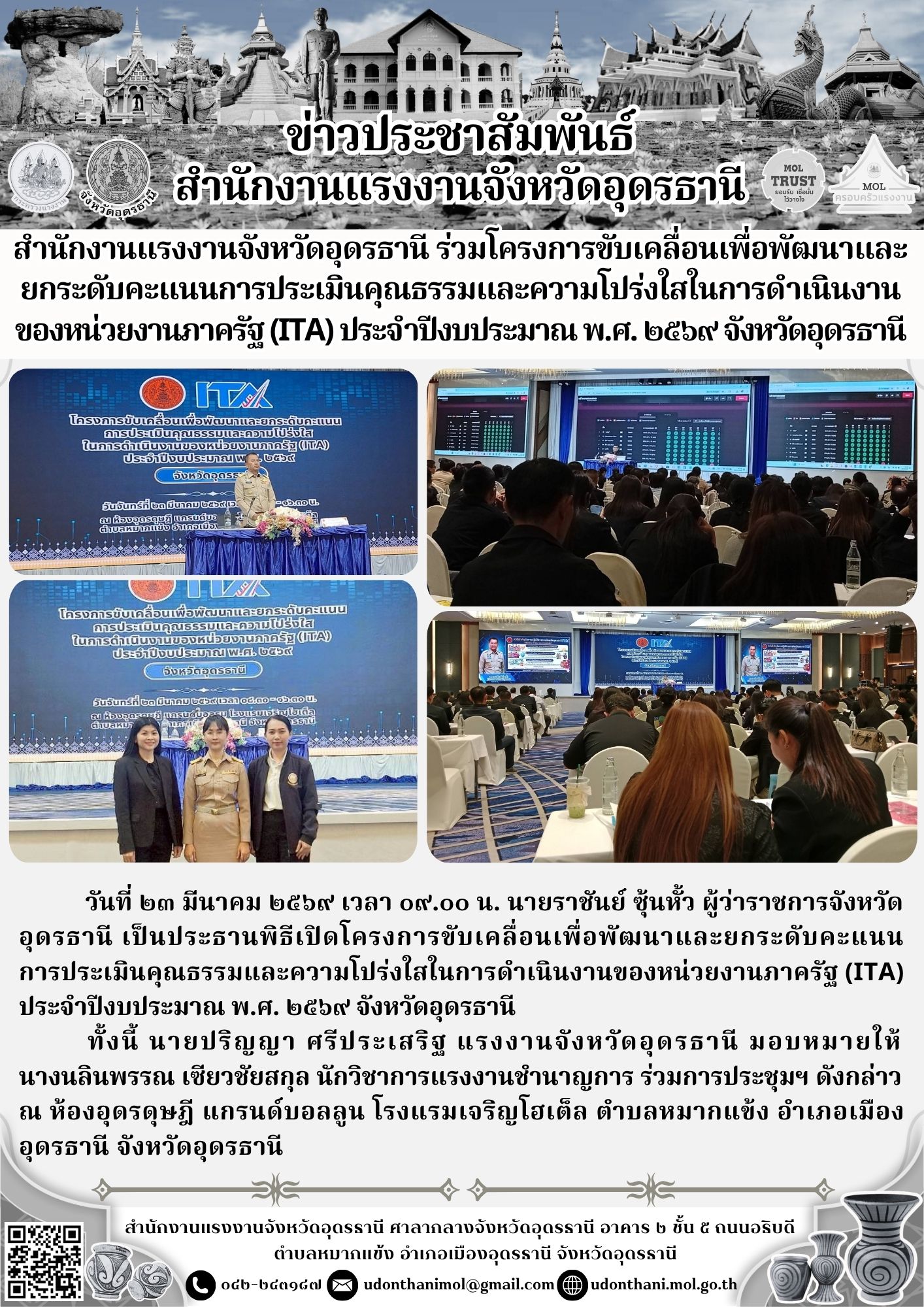 สำนักงานแรงงานจังหวัดอุดรธานี ร่วมโครงการขับเคลื่อนเพื่อพัฒนาและ ยกระดับคะแนนการประเมินคุณธรรมและความโปร่งใสในการดำเนินงานของหน่วยงานภาครัฐ (ITA) ประจำปีงบประมาณ พ.ศ. ๒๕๖๙ จังหวัดอุดรธานี