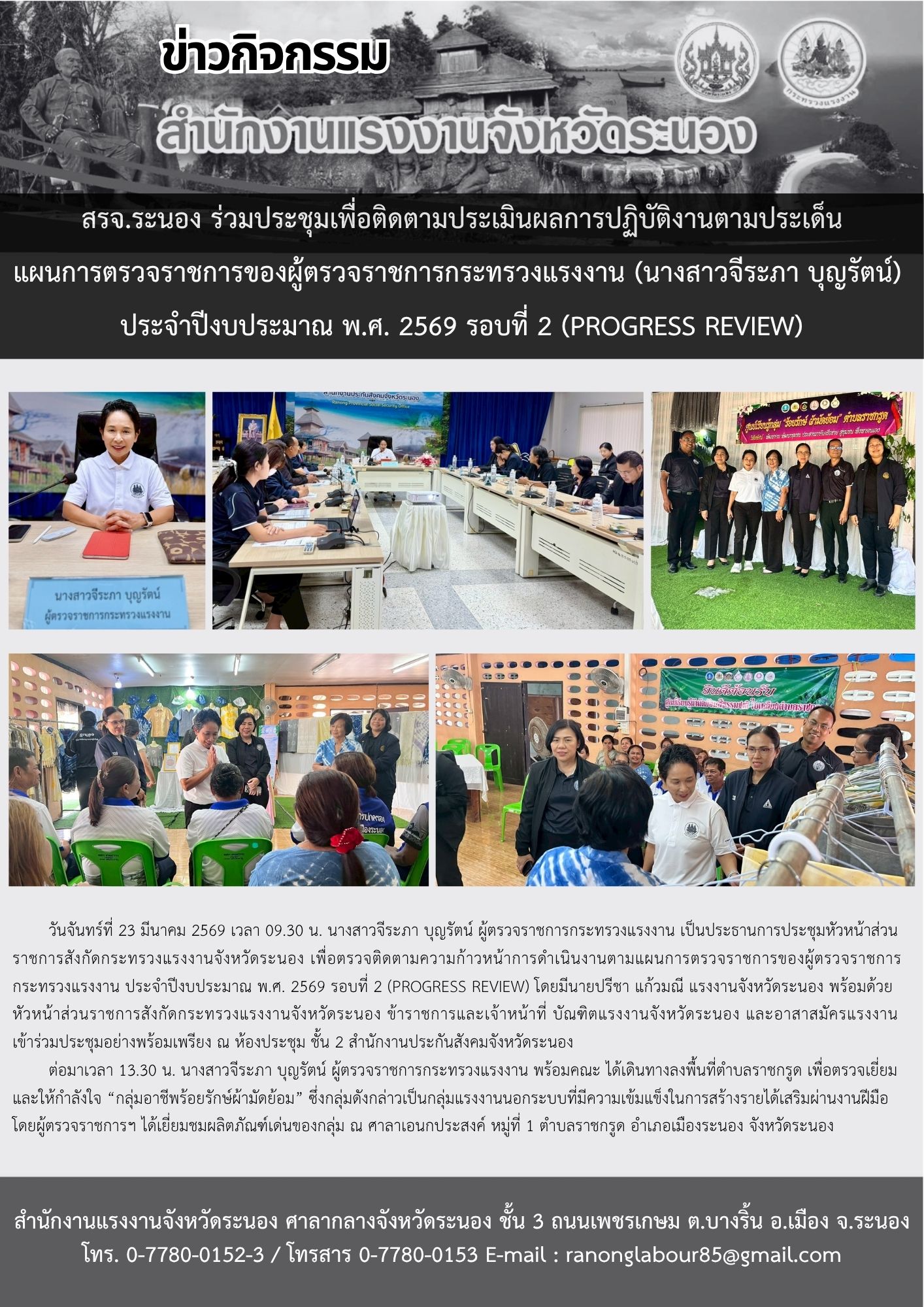 การตรวจราชการตามแผนการตรวจราชการ ของผู้ตรวจราชการกระทรวงแรงงาน ประจำปีงบประมาณ พ.ศ. 2569 รอบที่ 2 (Progress Review)