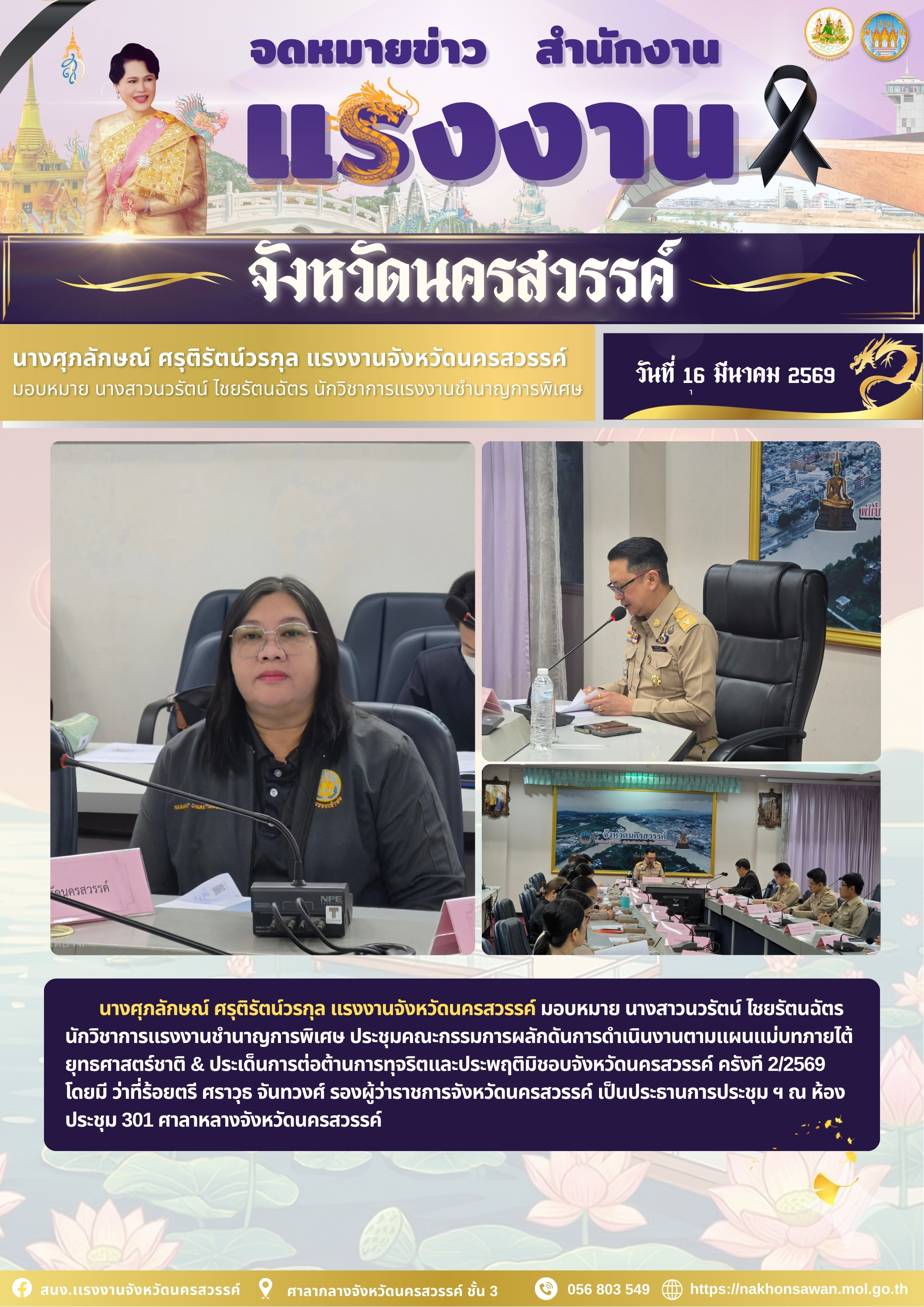 นางศุภลักษณ์ ศรุติรัตน์วรกุล แรงงานจังหวัดนครสวรรค์ มอบหมาย นางสาวนวรัตน์ ไชยรัตนฉัตร นักวิชาการแรงงานชำนาญการพิเศษ ประชุมคณะกรรมการผลักดันการดําเนินงานตามแผนแม่บทภายไต้ยุทธศาสตร์ชาติ & ประเด็นการต่อต้านการทุจริตและประพฤติมิชอบจังหวัดนครสวรรค์ ครังที 2/2569 โดยมี ว่าที่ร้อยตรี ศราวุธ จันทวงศ์ รองผู้ว่าราชการจังหวัดนครสวรรค์ เป็นประธานการประชุม ฯ ณ ห้องประชุม 301 ศาลาหลางจังหวัดนครสวรรค์