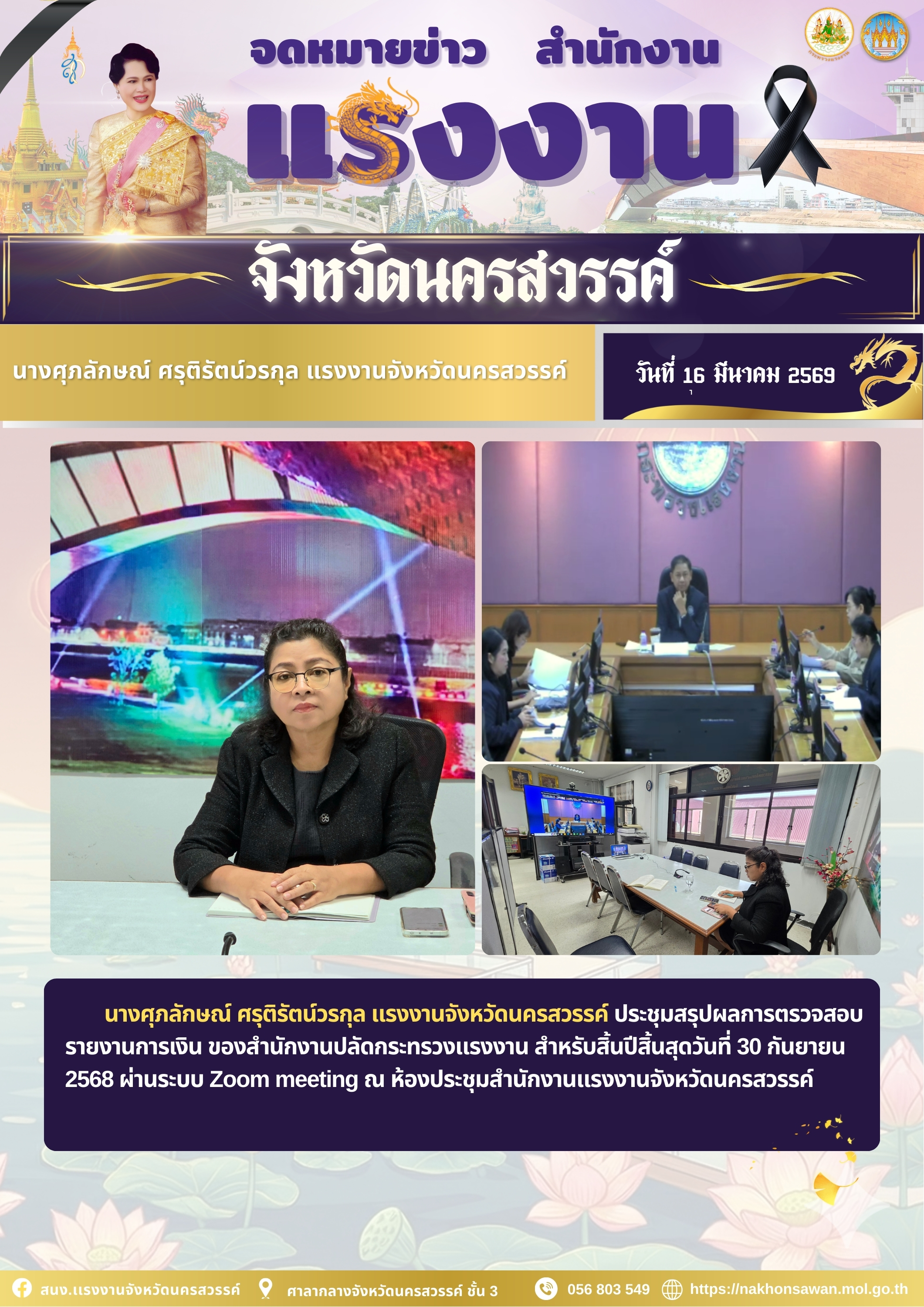 นางศุภลักษณ์ ศรุติรัตน์วรกุล แรงงานจังหวัดนครสวรรค์ ประชุมสรุปผลการตรวจสอบรายงานการเงิน ของสำนักงานปลัดกระทรวงแรงงาน สำหรับสิ้นปีสิ้นสุดวันที่ 30 กันยายน 2568 ผ่านระบบ Zoom meeting ณ ห้องประชุมสำนักงานแรงงานจังหวัดนครสวรรค์