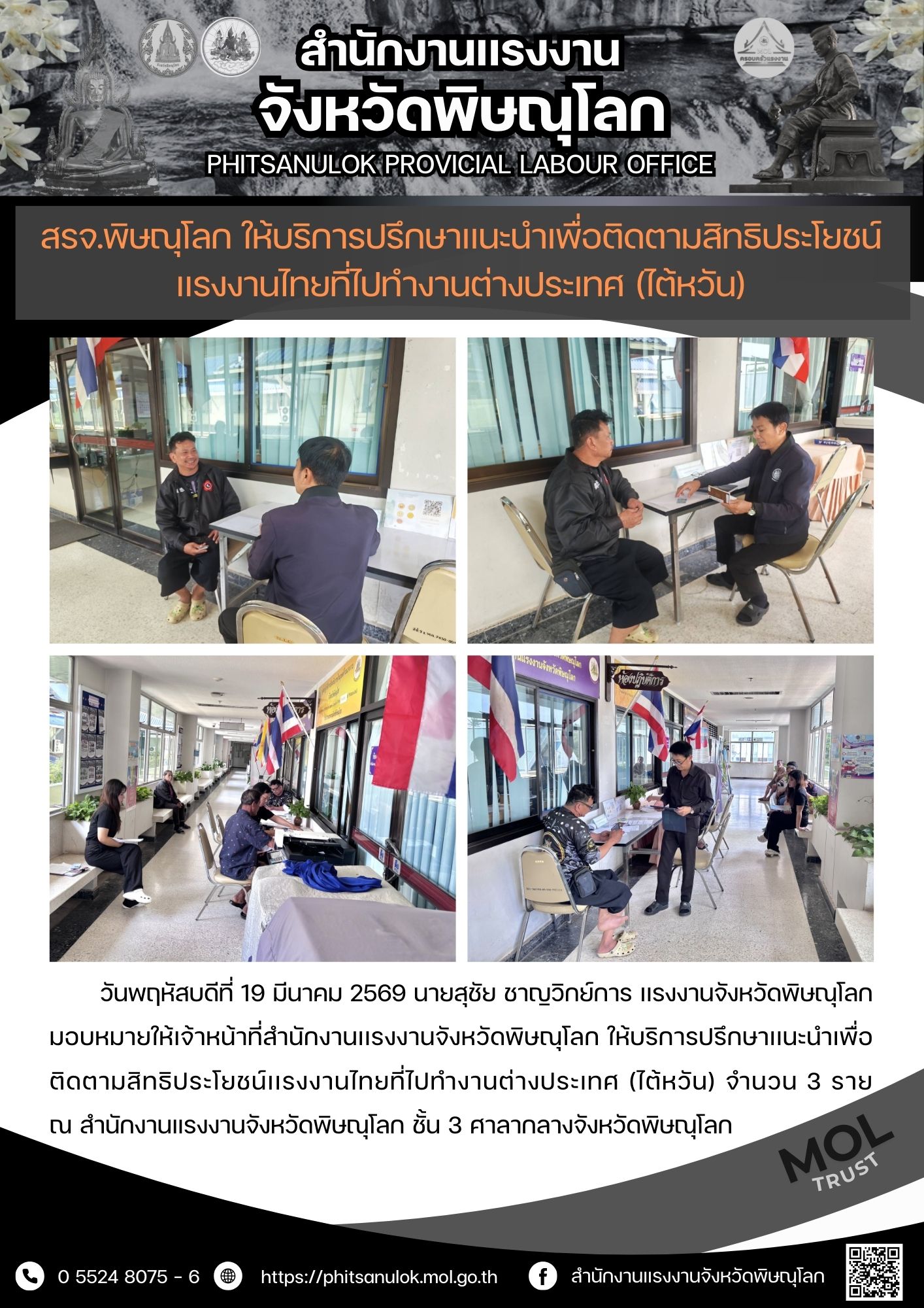สรจ.พิษณุโลก ให้บริการปรึกษาเเนะนำเพื่อติดตามสิทธิประโยชน์เเรงงานไทยที่ไปทำงานต่างประเทศ (ไต้หวัน)