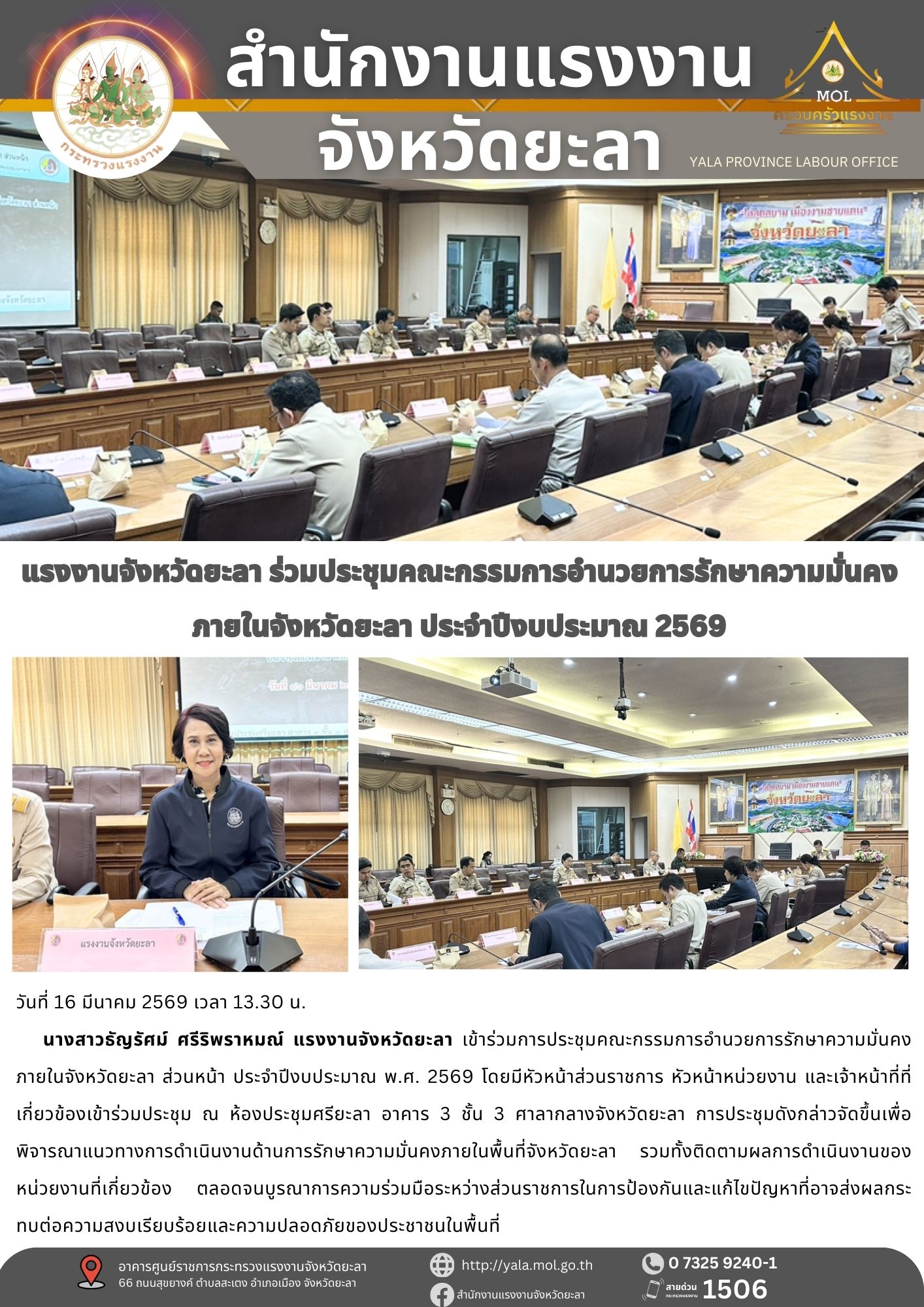 แรงงานจังหวัดยะลา ร่วมประชุมคณะกรรมการอำนวยการรักษาความมั่นคง ภายในจังหวัดยะลา ประจำปีงบประมาณ 2569