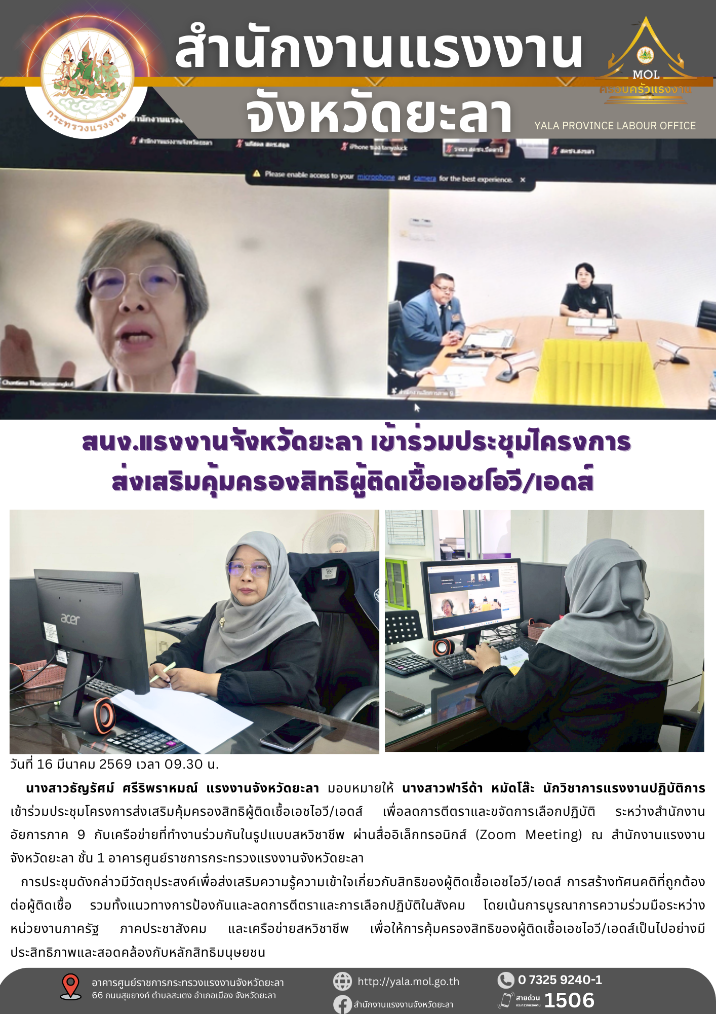 สนง.แรงงานจังหวัดยะลา เข้าร่วมประชุมโครงการ ส่งเสริมคุ้มครองสิทธิผู้ติดเชื้อเอชไอวี/เอดส์