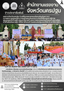 แรงงานจังหวัดนครปฐม ร่วมพิธีสวดพระพุทธมนต์และเจริญจิตตภาวนา ถวายพระราชกุศลแด่พระบาทสมเด็จพระปรเมนทรรามาธิบดีศรีสินทรมหาวชิราวุธ พระมงกุฎเกล้าเจ้าอยู่หัว พระมหาธีรราชเจ้า และถวายพระกุศลแด่สมเด็จพระเจ้าบรมวงศ์เธอ เจ้าฟ้าเพชรรัตนราชสุดา สิริโสภาพัณณวดี กรมพระนครปฐมบรมขัตติยานี มหาธีรราชธิดา