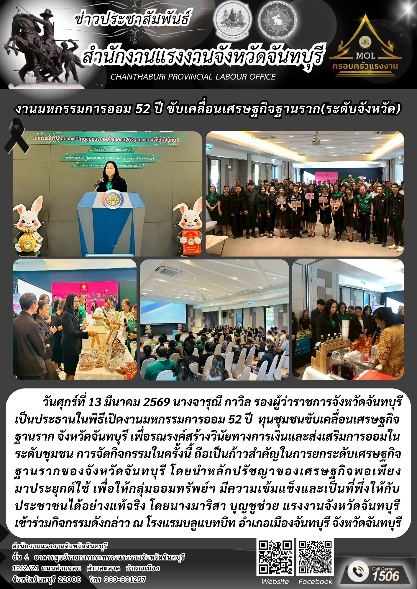 แรงงานจังหวัดจันทบุรี ร่วมพิธีเปิดงานมหกรรมการออม 52 ปี ทุนชุมชนขับเคลื่อนเศรษฐกิจฐานรากจังหวัดจันทบุรี