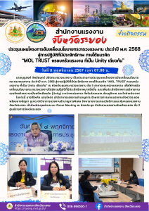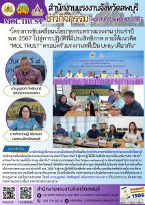 สรจ.ลพบุรี โครงการขับเคลื่อนนโยบายกระทรวงแรงงาน ประจำปี พ.ศ. 2567 ไปสู่การปฏิบัติที่มีประสิทธิภาพ ภายใต้แนวคิด “MOL TRUST” ครอบครัวแรงงานทที่เป็น Unity เดียวกัน