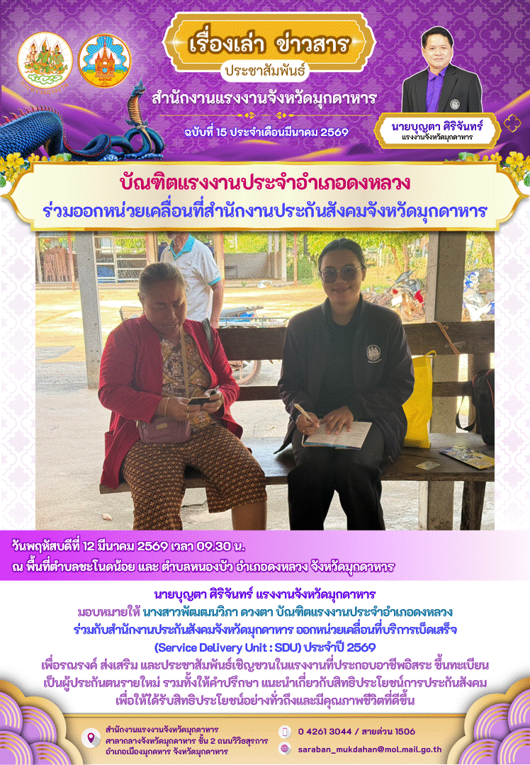 บัณฑิตแรงงานประจำอำเภอดงหลวง ร่วมออกหน่วยเคลื่อนที่สำนักงานประกันสังคมจังหวัดมุกดาหาร