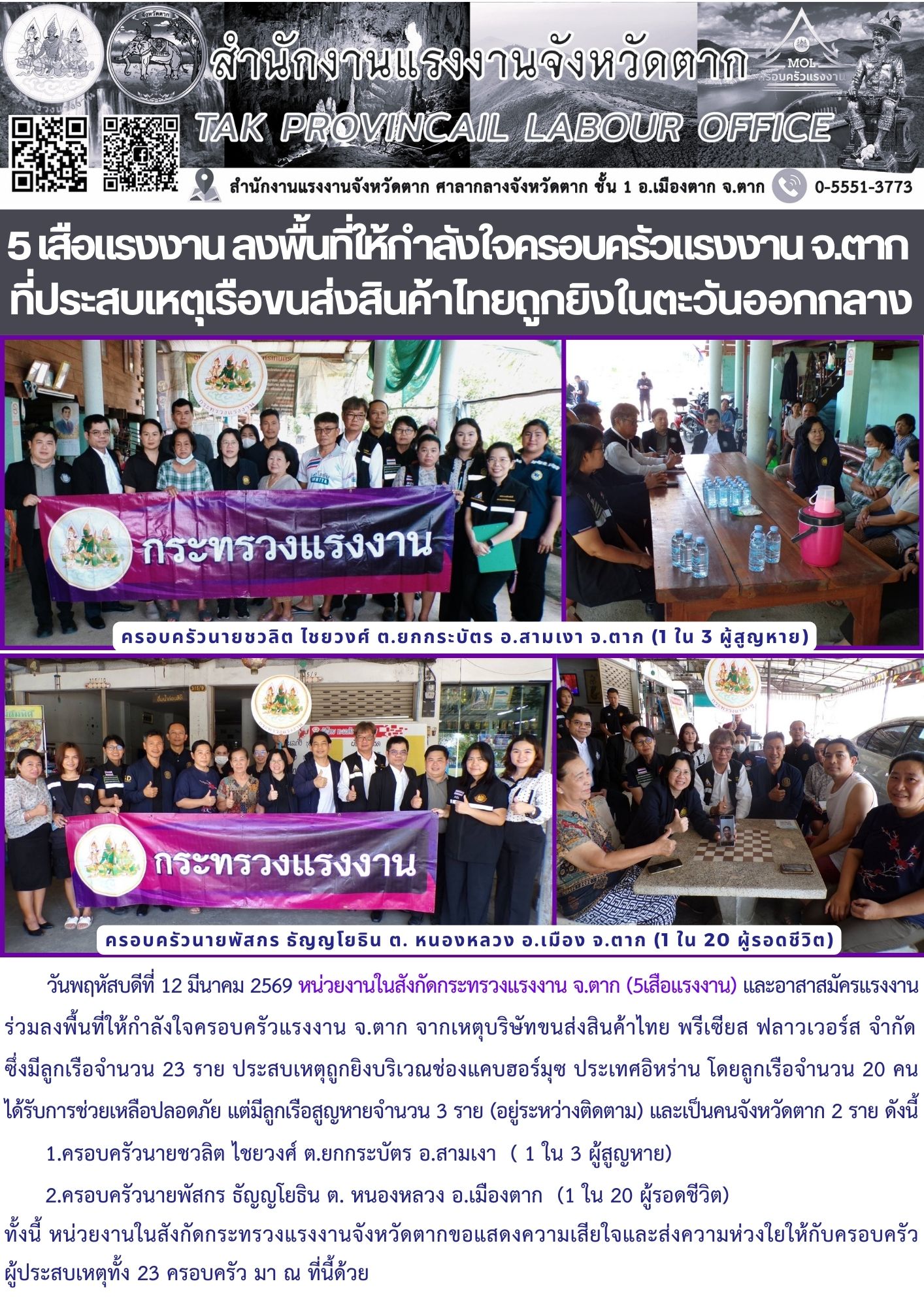5 เสือแรงงาน ลงพื้นที่ให้กำลังใจครอบครัวแรงงาน จ.ตาก ที่ประสบเหตุเรือขนส่งสินค้าไทยถูกยิงในตะวันออกกลาง