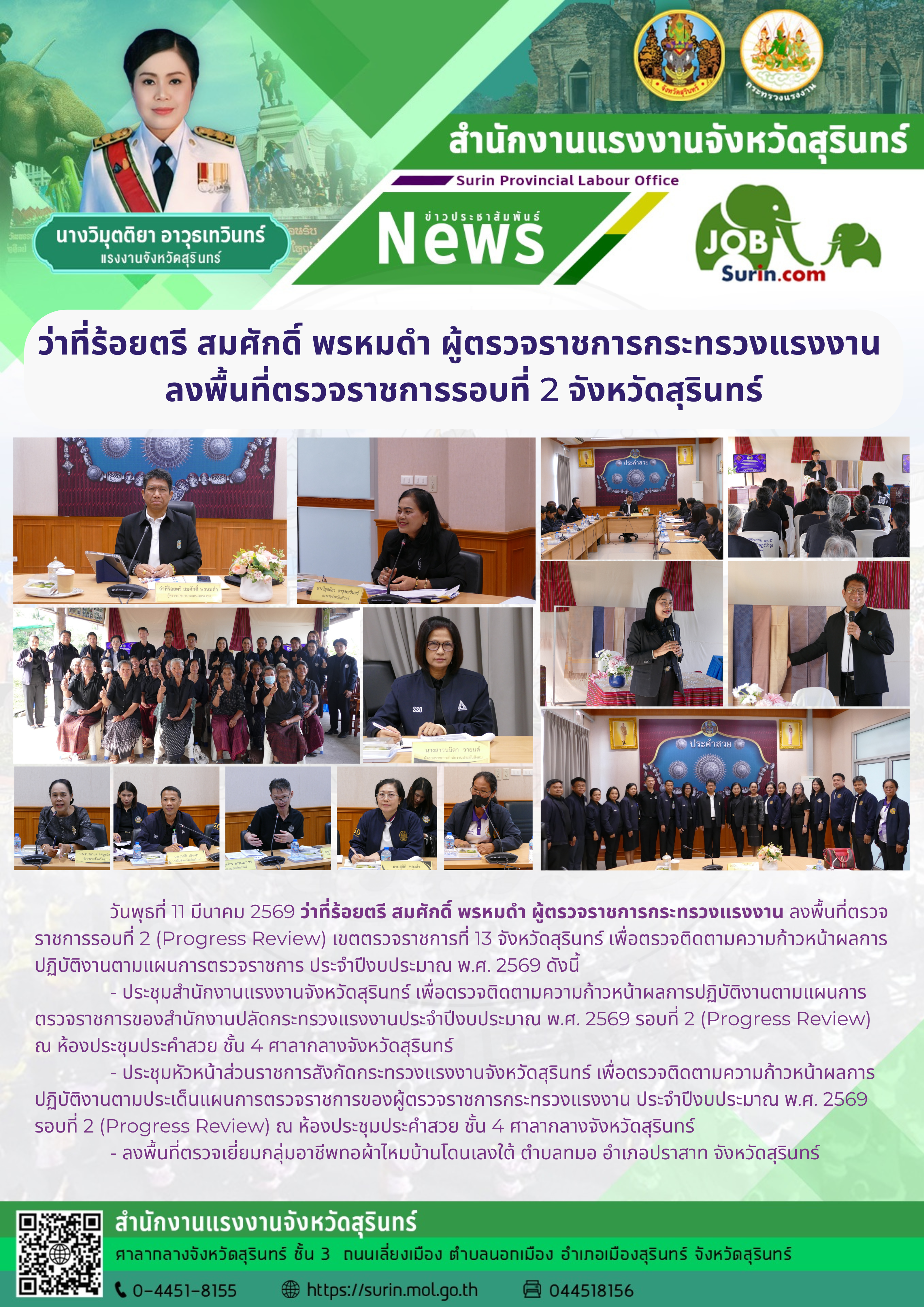 ว่าที่ร้อยตรี สมศักดิ์ พรหมดำ ผู้ตรวจราชการกระทรวงแรงงาน ลงพื้นที่ตรวจราชการรอบที่ 2 จังหวัดสุรินทร์