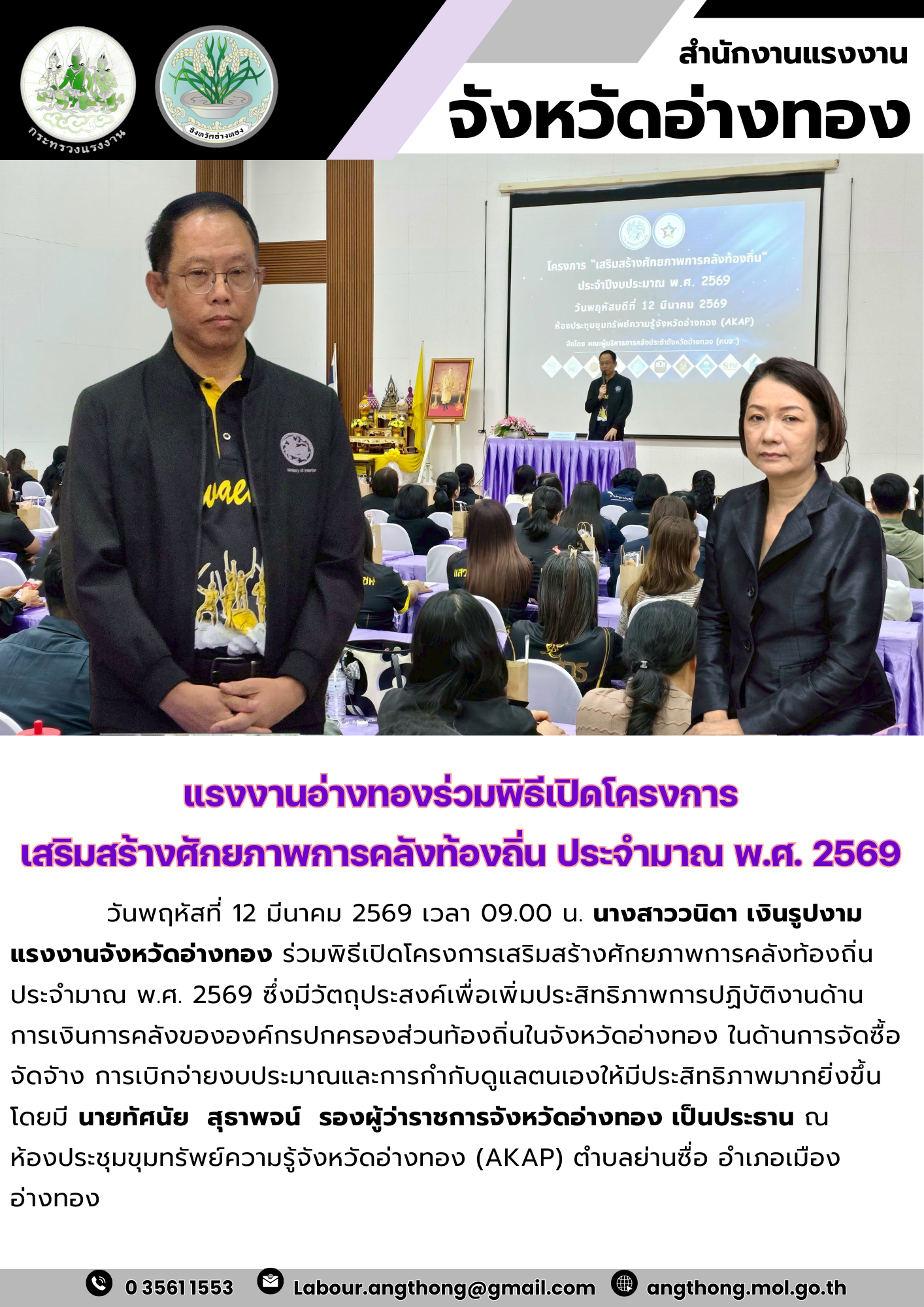 แรงงานอ่างทองร่วมพิธีเปิดโครงการ เสริมสร้างศักยภาพการคลังท้องถิ่น ประจำมาณ พ.ศ. 2569