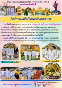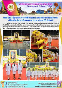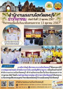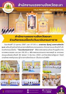 วันอาทิตย์ที่ 13 ตุลาคม 2567 หน่วยงานในสังกัดกระทรวงแรงงานจังหวัดนครศรีธรรมราช เข้าร่วมพิธีสวดพระพุทธมนต์ พิธีทำบุญตักบาตร และพิธีวางพวงมาลา เบื้องหน้าพระบรมฉายาลักษณ์ พระบาทสมเด็จพระบรมชนกาธิเบศร มหาภูมิพลอดุลยเดชมหาราช บรมนาถบพิตร โดยมี ผู้ว่าราชการจังหวัดนครศรีธรรมราช (นายขจรเกียรติ รักพานิชมณี) เป็นประธานในพิธี