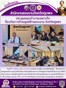 แรงงานจังหวัดชุมพร เป็นประธานการประชุมคณะทำงานเฉพาะกิจป้องกันการค้ามนุษย์ด้านแรงงาน จังหวัดชุมพร โดยหัวหน้าส่วนราชการสังกัดกระทรวงแรงงาน พร้อมด้วยคณะทำงานเฉพาะกิจป้องกันการค้ามนุษย์ด้านแรงงาน และเจ้าหน้าที่ประชุม ฯ