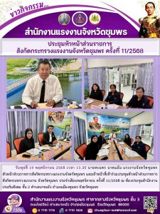 แรงงานจังหวัดชุมพร พร้อมด้วยหัวหน้าส่วนราชการสังกัดกระทรวงแรงงานจังหวัดชุมพร และเจ้าหน้าที่เข้าร่วมประชุมหัวหน้าส่วนราชการสังกัดกระทรวงแรงงาน จังหวัดชุมพร ประจำเดือนพฤศจิกายน ครั้งที่ 11/2568