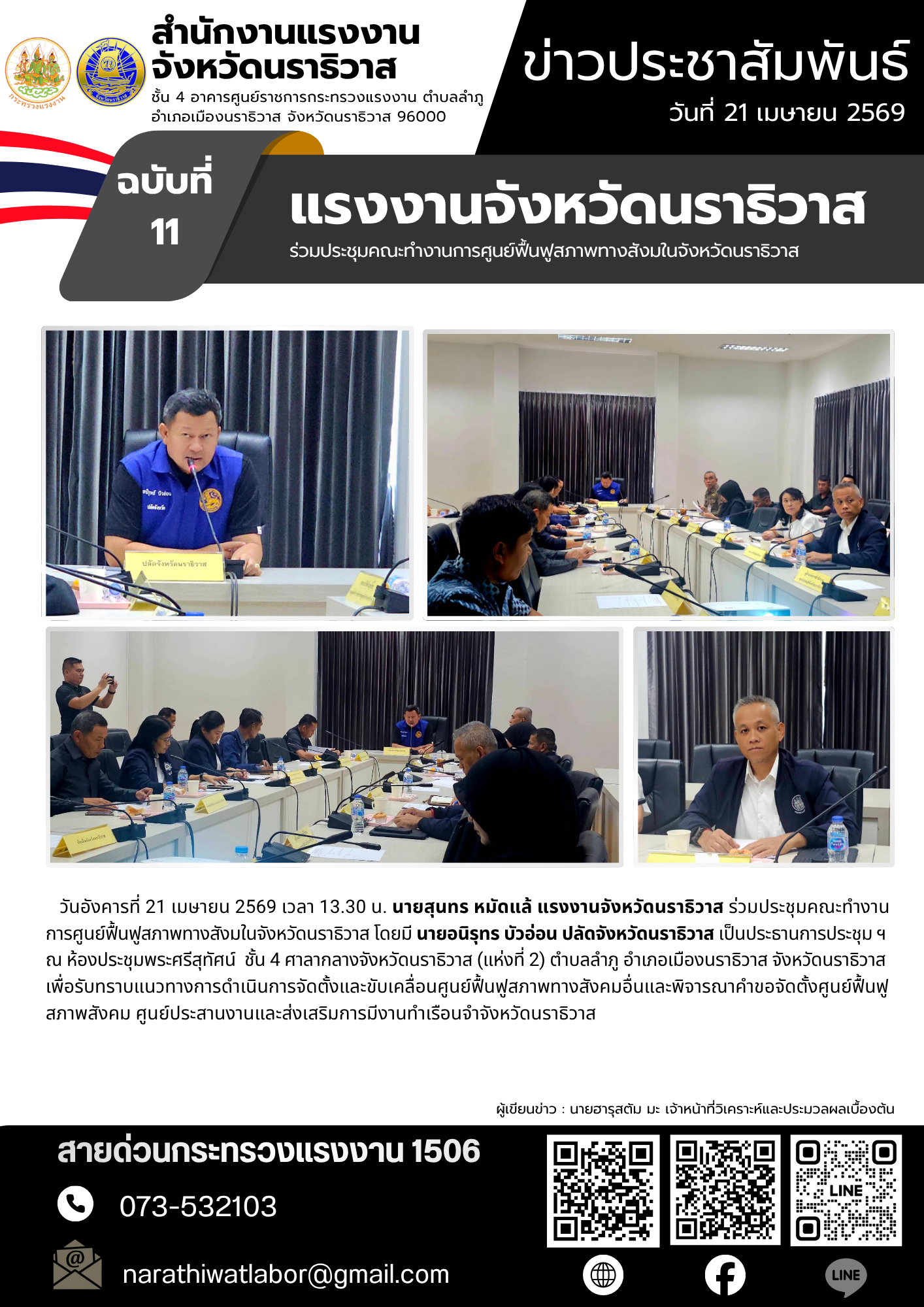 แรงงานจังหวัดนราธิวาส ร่วมประชุมคณะทำงานการศูนย์ฟื้นฟูสภาพทางสังคมในจังหวัดนราธิวาส