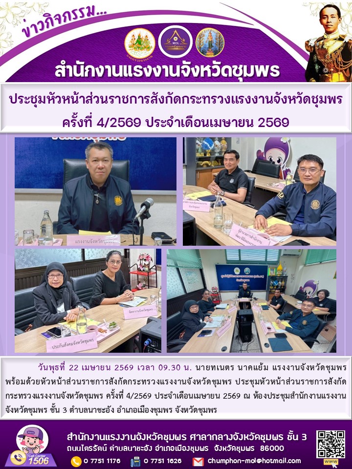 แรงงานจังหวัดชุมพร พร้อมด้วยหัวส่วนราชการสังกัดกระทรวงแรงงานจังหวัดชุมพร ประชุมหัวหน้าส่วนราชการสังกัดกระทรวงแรงงานจังหวัดชุมพร ครั้งที่ 4/2569 ประจำเดือนเมษายน 2569