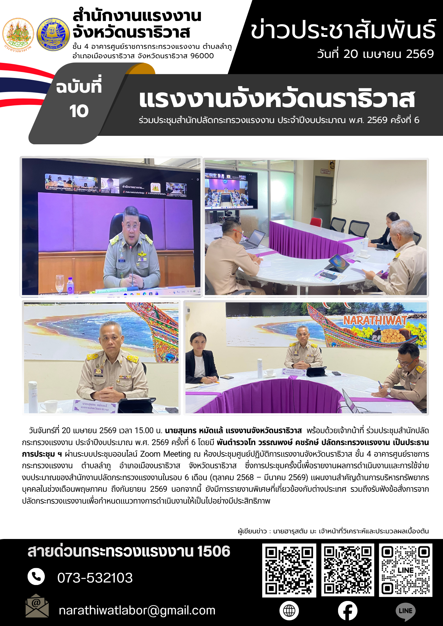 แรงงานจังหวัดนราธิวาส ร่วมประชุมสำนักปลัดกระทรวงแรงงาน ประจำปีงบประมาณ พ.ศ. 2569 ครั้งที่ 6