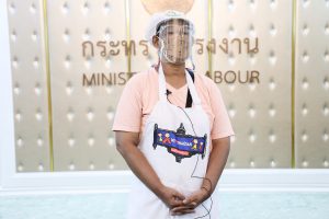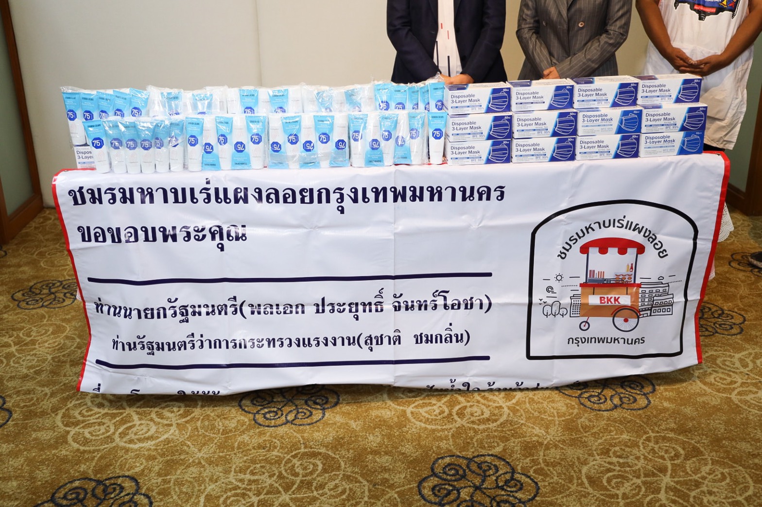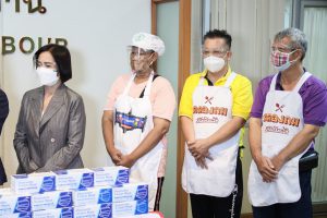 นางสาวญาดา พรเพชรรัมภา ประธานชมรมหาบเร่แผงลอยกรุงเทพมหานคร กล่าวว่า ในวันนี้ดิฉันและสมาชิกชมรมหาบเร่แผงลอยได้เดินทางมามอบกระเช้าเพื่อขอบคุณท่านนายกรัฐมนตรี ผ่านท่านรัฐมนตรีว่าการกระทรวงแรงงาน ที่ท่านเมตตาและเห็นความสำคัญแม่ค้าหาบเร่แผงลอยที่ได้ช่วยเหลือชมรมให้ได้เข้าร่วมโครงการปันน้ำใจร้านค้าสู่แรงงาน โดยการจัดทำข้าวกล่องส่งแคมป์คนงาน ซึ่งสมาชิกที่ได้เข้าร่วมโครงการตั้งแต่วันที่ 12-27 กรกฎาคมที่ผ่านมา รวมทั้งสิ้น 16 วัน ทุกคนต่างพ้นวิกฤตจากความทุกข์ร้อนไปได้ และในวันนี้ดิฉันในฐานะประธานชมรมหาบเร่แผงลอยได้พูดคุยกับสมาชิกในชมรมและให้แรงบันดาลใจว่า เมื่อเราได้มีโอกาสได้รับการช่วยเหลือแล้ววันหนึ่งเราควรจะคืนโอกาสให้สังคม โดยหลังเสร็จสิ้นโครงการเมื่อวันที่ 27 กรกฎาคมแล้ว ชมรมได้จัดทำข้าวกล่องเพื่อแจกจ่ายให้กับคนเร่ร่อน จำนวน 5,500 กล่อง