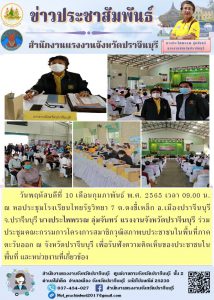 วันพฤหัสบดีที่ 10 เดือนกุมภาพันธ์ พ.ศ. 2565 เวลา 09.00 น. ณ หอประชุมโรงเรียนไทยรัฐวิทยา 7 ต.ดงขี้เหล็ก อ.เมืองปราจีนบุรี จ.ปราจีนบุรี นางประไพพรรณ ลุ่มจันทร์ แรงงานจังหวัดปราจีนบุรี ร่วมประชุมคณะกรรมการโครงการสมาชิกวุฒิสภาพบประชาชนในพื้นที่ภาคตะวันออก ณ จังหวัดปราจีนบุรี เพื่อรับฟังความคิดเห็นของประชาชนในพื้นที่ และหน่วยงานที่เกี่ยวข้อง