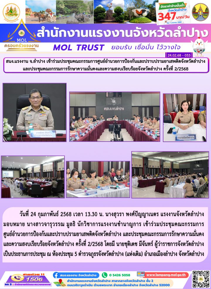 วันที่ 24 กุมภาพันธ์ 2568 เวลา 13.30 น. นางสุวรา พงศ์ปัญญาเนตร แรงงานจังหวัดลำปาง มอบหมาย นางสาวจารุวรรณ มูลธิ นักวิชาการแรงงานชำนาญการ เข้าร่วมประชุมคณะกรรมการศูนย์อำนวยการป้องกันและปราบปรามยาเสพติดจังหวัดลำปาง และประชุมคณะกรรมการรักษาความมั่นคงและความสงบเรียบร้อยจังหวัดลำปาง ครั้งที่ 2/2568 โดยมี นายชุติเดช มีจันทร์ ผู้ว่าราชการจังหวัดลำปาง เป็นประธานการประชุม ณ ห้องประชุม 5 ตำรวจภูธรจังหวัดลำปาง (แห่งเดิม) อำเภอเมืองลำปาง จังหวัดลำปาง