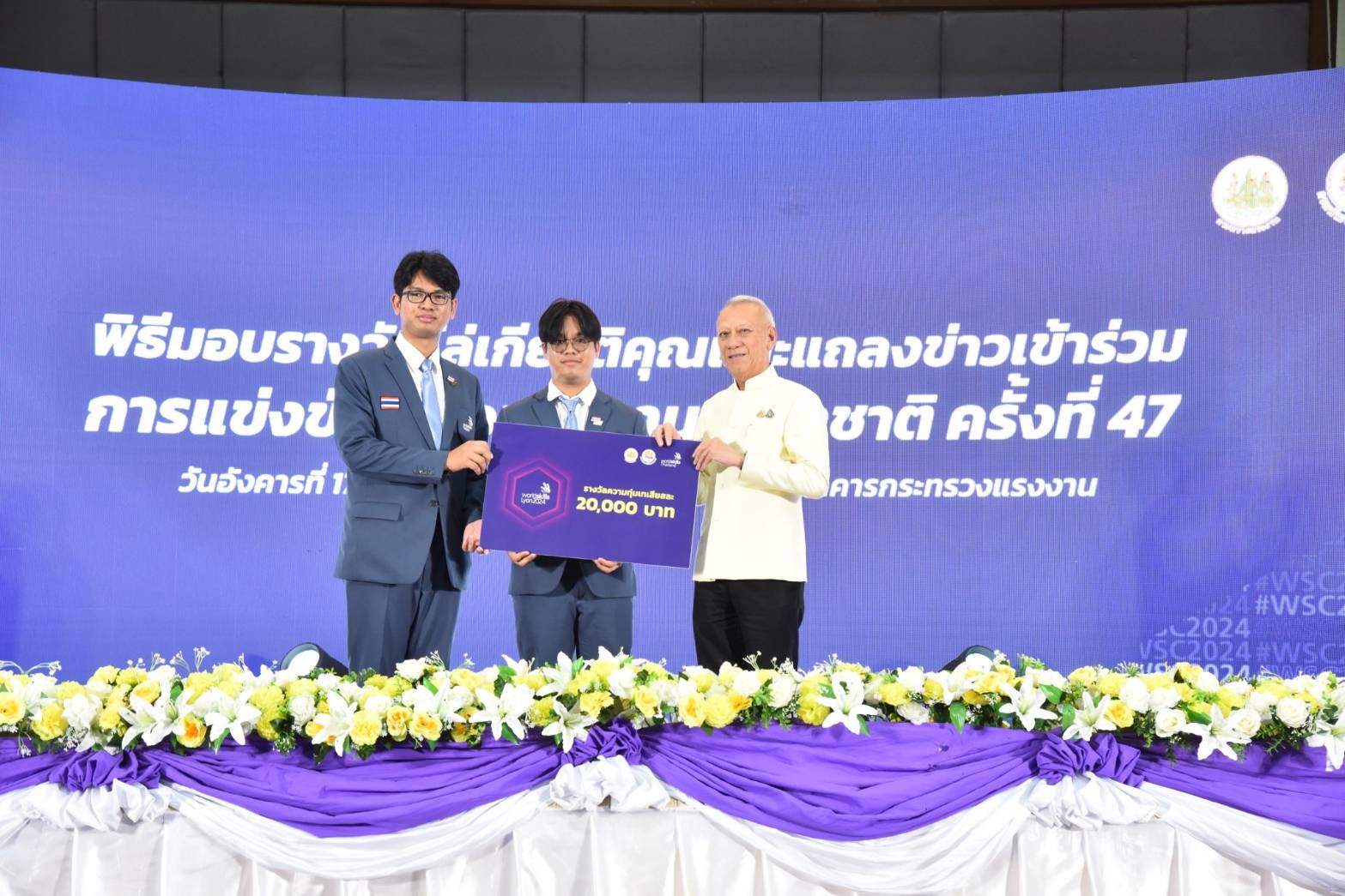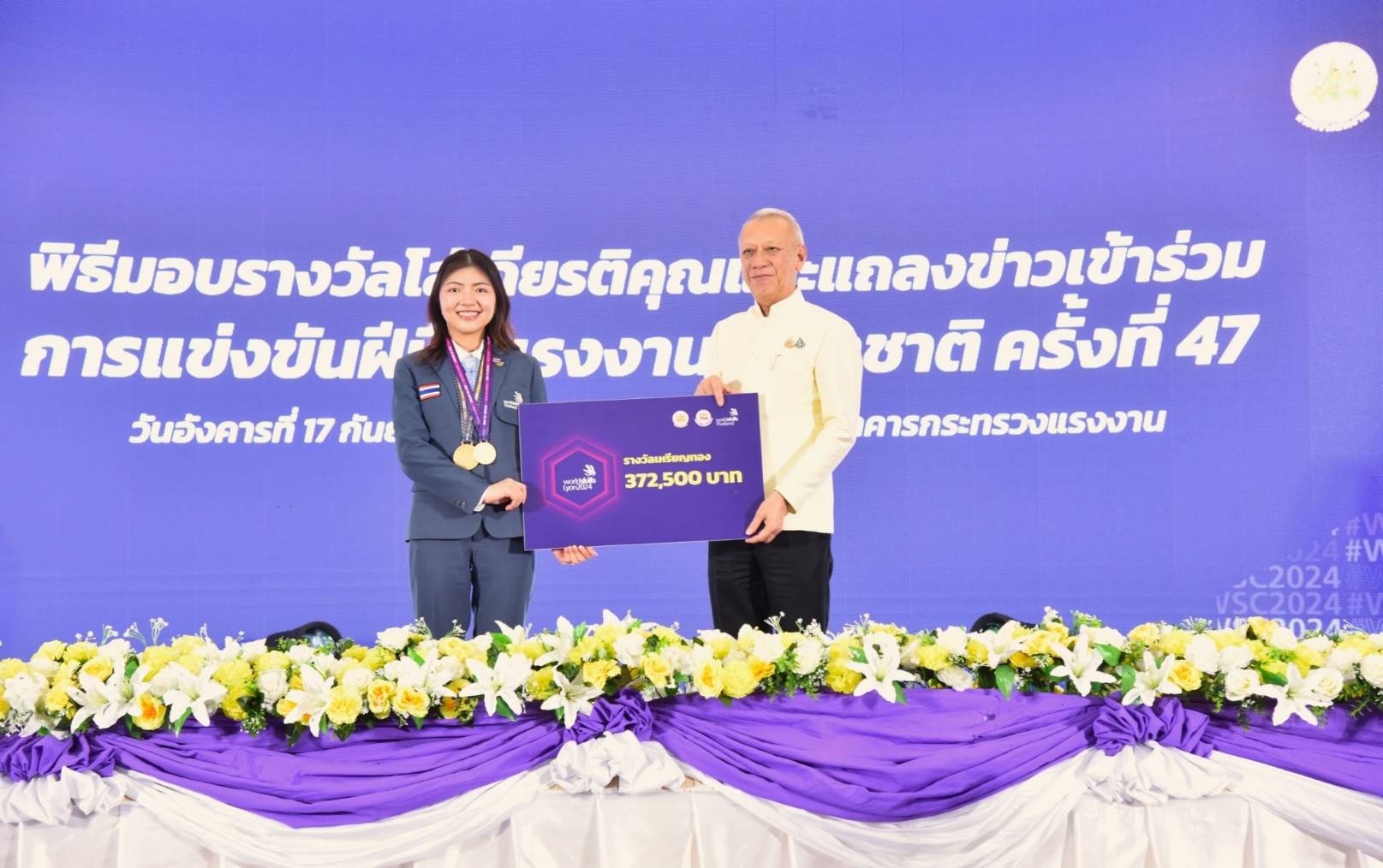 ด้าน นางสาวบุปผา เรืองสุด อธิบดีกรมพัฒนาฝีมือแรงงาน กล่าวเพิ่มเติมว่า การแข่งขันฯ ในครั้งนี้ ได้รับความร่วมมือและให้การสนับสนุนอย่างดียิ่งจากหลายหน่วยงาน ทั้งสถาบันการศึกษา หน่วยงานภาครัฐ และภาคเอกชน อาทิ บริษัท Denso International Asia co.ltd บริษัท เค คอนซัลติ้ง แอนด์ ซัพพลาย จำกัด โรงเรียนพยาบาลรามาธิบดี มูลนิธิเอสซีจี บริษัท โตโยต้า มอเตอร์ ประเทศไทย จำกัด บริษัท โตโยต้า ไดฮัทสุ เอ็นจิเนียร์ริ่ง แอนด์ เมนูแฟคเจอริ่ง จำกัด มหาวิทยาลัยศิลปากร วิทยาเขตสารสนเทศเพชรบุรี มหาวิทยาลัยศรีปทุม วิทยาลัยดุสิตธานี เป็นต้น และในวันนี้ได้จัดพิธีมอบเงินรางวัล รวมมูลค่า 1,098,000 บาท ประกอบด้วย ประเภทเดี่ยว เหรียญทอง 372,500 บาท เหรียญเงิน 248,500 บาท เหรียญทองแดง 124,000 บาท เหรียญฝีมือยอดเยี่ยม 51,000 บาท น้อง ๆ ที่ไม่ได้รับเหรียญรางวัลจะได้รับทุนการศึกษาคนละ 10,000 บาท ส่วนประเภททีม เหรียญทอง 745,000 บาท เหรียญเงิน 497,000 บาท เหรียญทองแดง 248,000 บาท เหรียญฝีมือยอดเยี่ยม 102,000 บาท และรางวัลปลอบใจเป็นทุนการศึกษาทีมละ 20,000 บาท นอกจากนี้ ยังมีภาคเอกชนมอบเงินเป็นรางวัลของความทุ่มเทและเสียสละให้แก่น้อง ๆ ผู้เข้าแข่งขันอีกด้วย และในอีก 2 ปีข้างหน้า ปี พ.ศ. 2569 การแข่งขันฝีมือแรงงานนานาชาติ ครั้งที่ 48 จะจัดขึ้น ณ เมืองเซี่ยงไฮ้ สาธารณรัฐประชาชนจีน ในช่วงเวลาต่อจากนี้ กรมพัฒนาฝีมือแรงงาน จะทำการคัดเลือกเยาวชนรุ่นใหม่เพื่อเตรียมเก็บตัวฝึกซ้อมเข้าแข่งขันในครั้งต่อไป