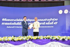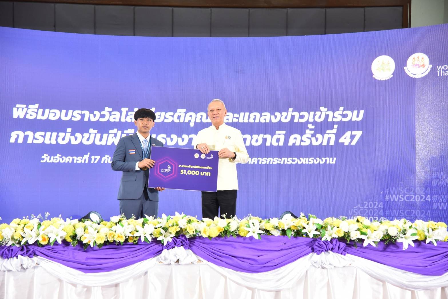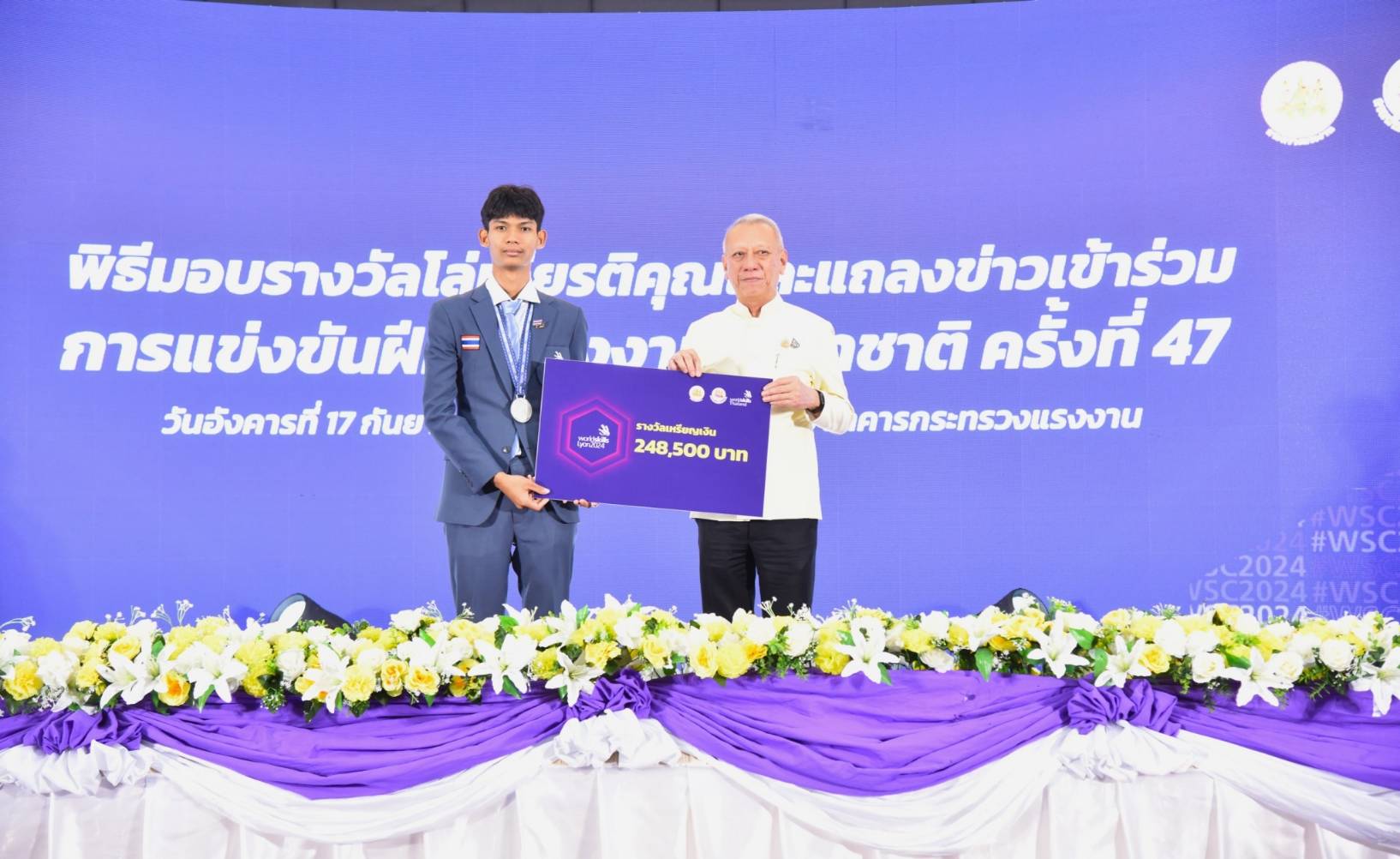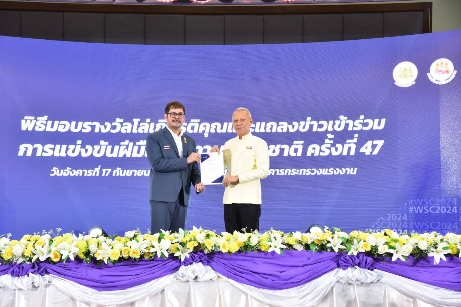 วันที่ 17 กันยายน 2567 เวลา 18.00 น. นายพิพัฒน์ รัชกิจประการ รัฐมนตรีว่าการกระทรวงแรงงาน เป็นประธานมอบรางวัล เกียรติบัตรผู้เข้าแข่งขัน World Skills Lyon 2024 และมอบโล่ประกาศเกียรติคุณผู้สนับสนุนการแข่งขันฯ หลังเยาวชนสร้างชื่อเสียงให้ประเทศไทยคว้า 1 เหรียญทอง 1 เหรียญเงินและ