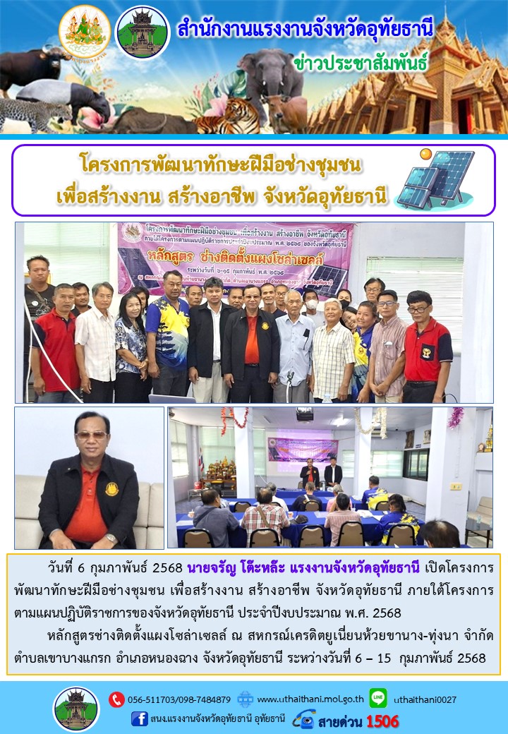 เปิดโครงการพัฒนาทักษะฝีมือช่างชุมชน เพื่อสร้างงาน สร้างอาชีพ จังหวัดอุทัยธานี ภายใต้โครงการ ตามแผนปฏิบัติราชการของจังหวัดอุทัยธานี ประจำปีงบประมาณ พ.ศ. 2568 หลักสูตรช่างติดตั้งแผงโซล่าเซลล์