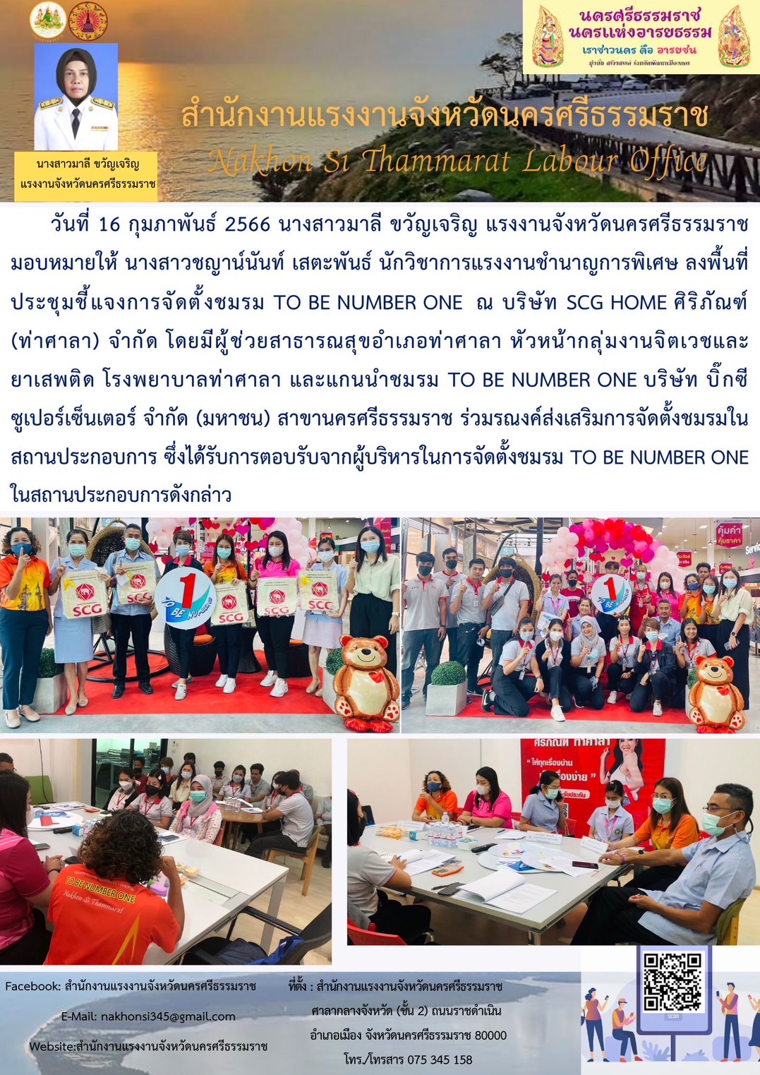 เมื่อวันที่ 16 กุมภาพันธ์ 2566 นางสาวมาลี ขวัญเจริญ แรงงานจังหวัดนครศรีธรรมราช มอบหมายให้ นางสาวชญาน์นันท์ เสตะพันธ์ นักวิชาการแรงงานชำนาญการพิเศษ ลงพื้นที่ประชุมชี้แจงการจัดตั้งชมรม TO BE NUMBER ONE ณ บริษัท SCG HOME ศิริภัณฑ์ (ท่าศาลา) จำกัด โดยมีผู้ช่วยสาธารณสุขอำเภอท่าศาลา หัวหน้ากลุ่มงานจิตเวชและยาเสพติด โรงพยาบาลท่าศาลา และแกนนำชมรม TO BE NUMBER ONE บริษัท บิ๊กซี ซูเปอร์เซ็นเตอร์ จำกัด (มหาชน) สาขานครศรีธรรมราช ร่วมรณงค์ส่งเสริมการจัดตั้งชมรมในสถานประกอบการ ซึ่งได้รับการตอบรับจากผู้บริหารในการจัดตั้งชมรม TO BE NUMBER ONE ในสถานประกอบการดังกล่าว