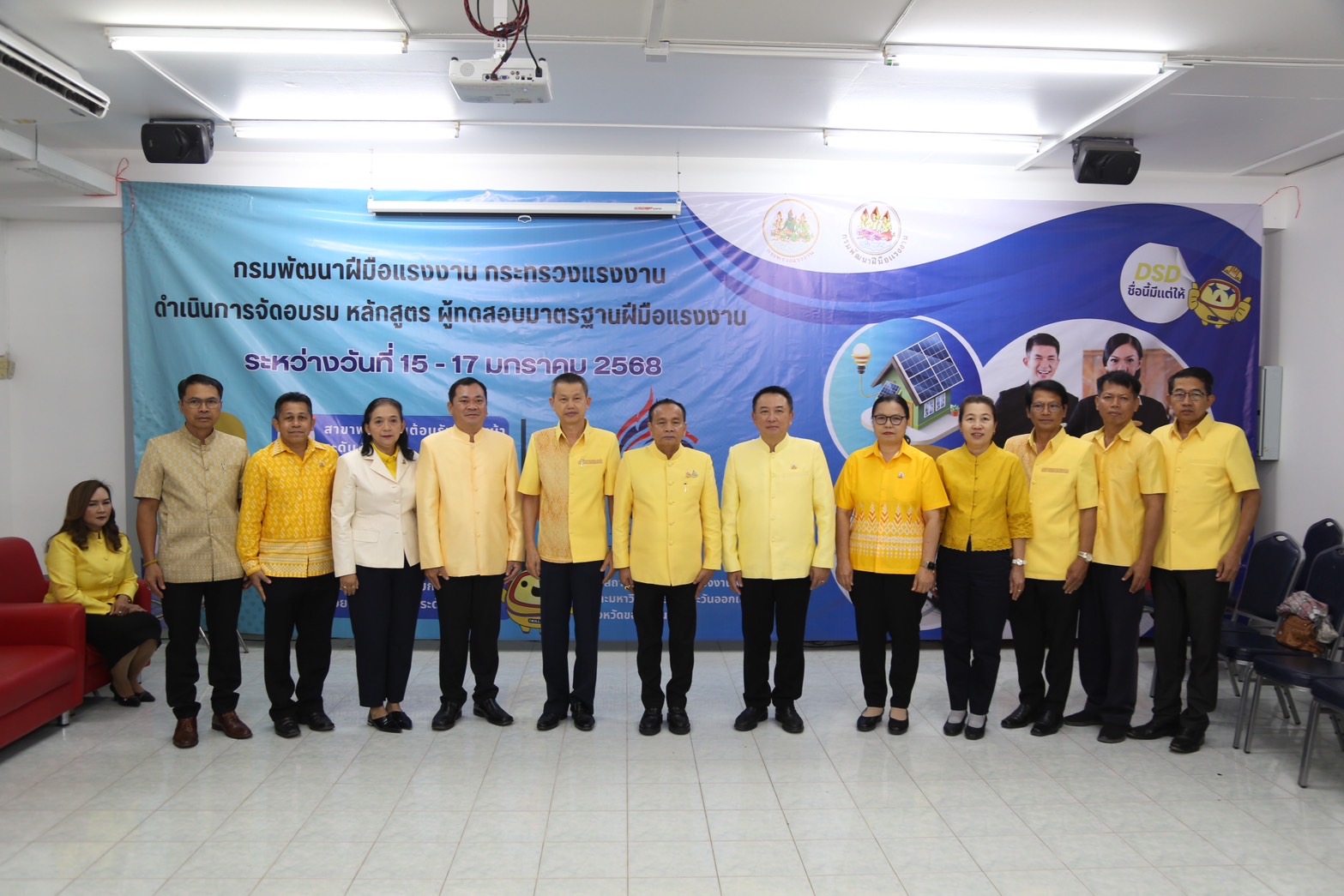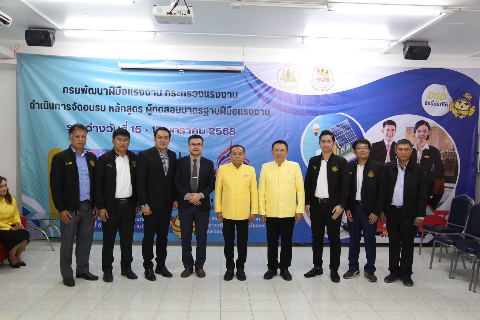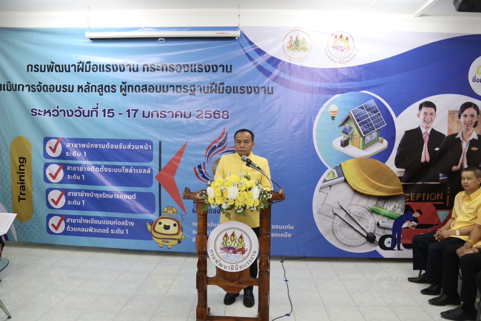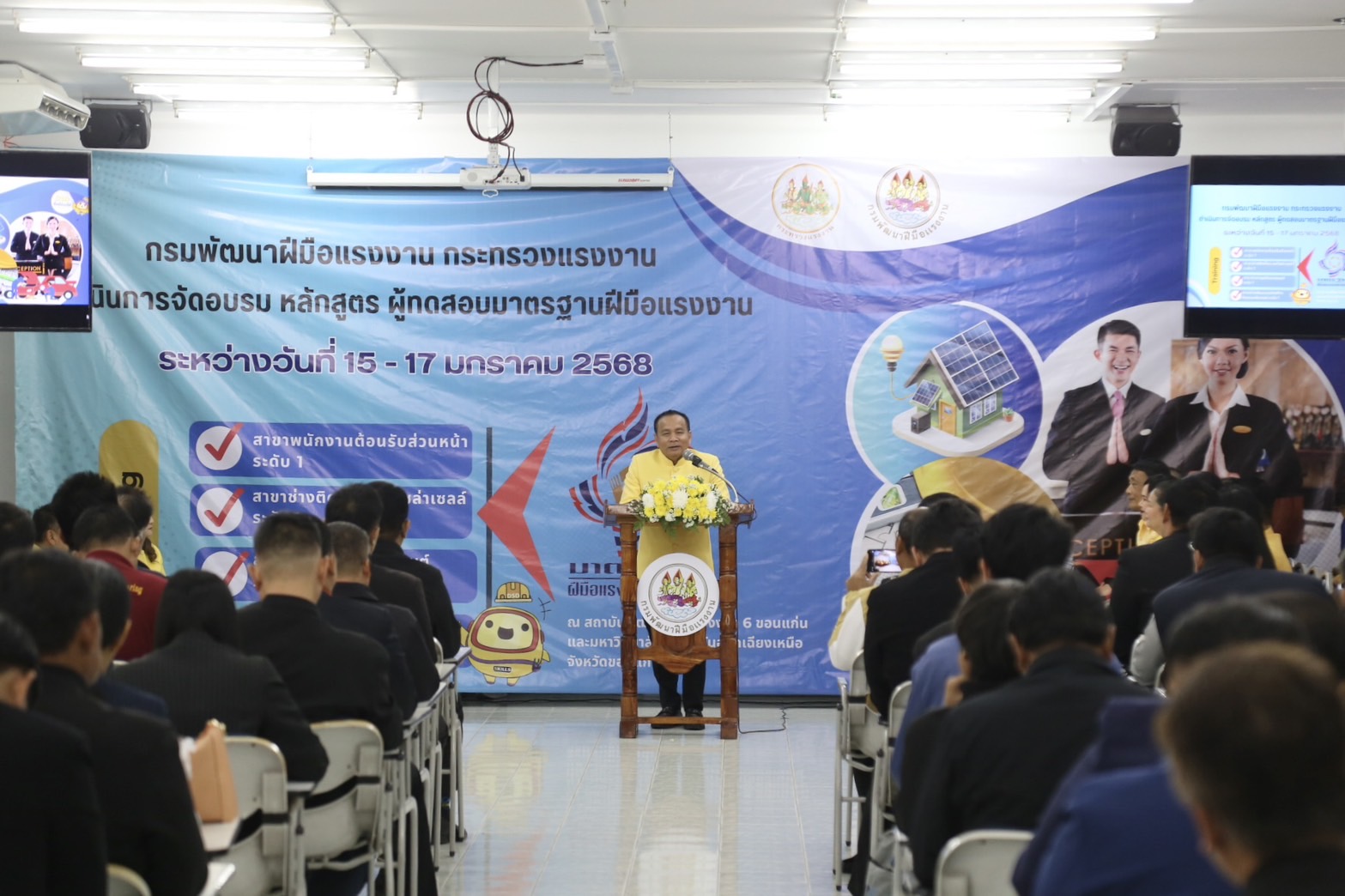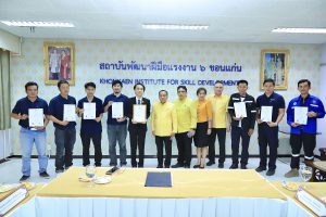 ด้านนายเดชา พฤกษ์พัฒนรักษ์ อธิบดีกรมพัฒนาฝีมือแรงงาน กล่าวเสริมว่า การฝึกอบรมในครั้งนี้เป็นการฝึกอบรมการเป็นผู้ทดสอบมาตรฐานฝีมือแรงงาน ระยะการฝึก 18 ชั่วโมง จำนวน 4 หลักสูตร ประกอบด้วย 1) ช่างบำรุงรักษารถยนต์ ระดับ 1 2) ช่างติดตั้งระบบโซลาร์เซลล์ ระดับ 1 3) ช่างเขียนแบบก่อสร้างด้วยคอมพิวเตอร์ ระดับ 1 และ 4) พนักงานต้อนรับส่วนหน้า ระดับ 1 อบรมระหว่างวันที่ 15 – 17 มกราคม 2568 ซึ่งอบรมที่สถาบันพัฒนาฝีมือแรงงาน 6 ขอนแก่น และมหาวิทยาลัยภาคตะวันออกเฉียงเหนือ มีผู้อบรมทั้งหมดจำนวน 120 คน ผู้เข้ารับการฝึกอบรมมีความรู้ ความเข้าใจ ในหลักเกณฑ์ วิธีการทดสอบ การจัดเตรียมสถานที่ วัสดุอุปกรณ์ รวมทั้งการควบคุม และตรวจผลการทดสอบ ซึ่งทำให้ผู้ผ่านการฝึกอบรม สามารถทำหน้าที่เป็นผู้ทดสอบมาตรฐานฝีมือแรงงานที่มีประสิทธิภาพ และมีความเที่ยงตรง ทั้งนี้ ผู้ผ่านการฝึกอบรมจะได้รับการประกาศรายชื่อเป็นผู้มีคุณสมบัติเหมาะสมที่จะทำหน้าที่เป็นผู้ทดสอบมาตรฐานฝีมือแรงงาน และได้รับวุฒิบัตรหลักสูตรผู้ทดสอบมาตรฐานฝีมือแรงงาน จากกรมพัฒนาฝีมือแรงงานเพื่อเป็นการการันตีให้แก่ผู้ทำหน้าที่ทดสอบสร้างความเชื่อมั่นและเป็นมาตรฐานเดียวกันในการทำงาน