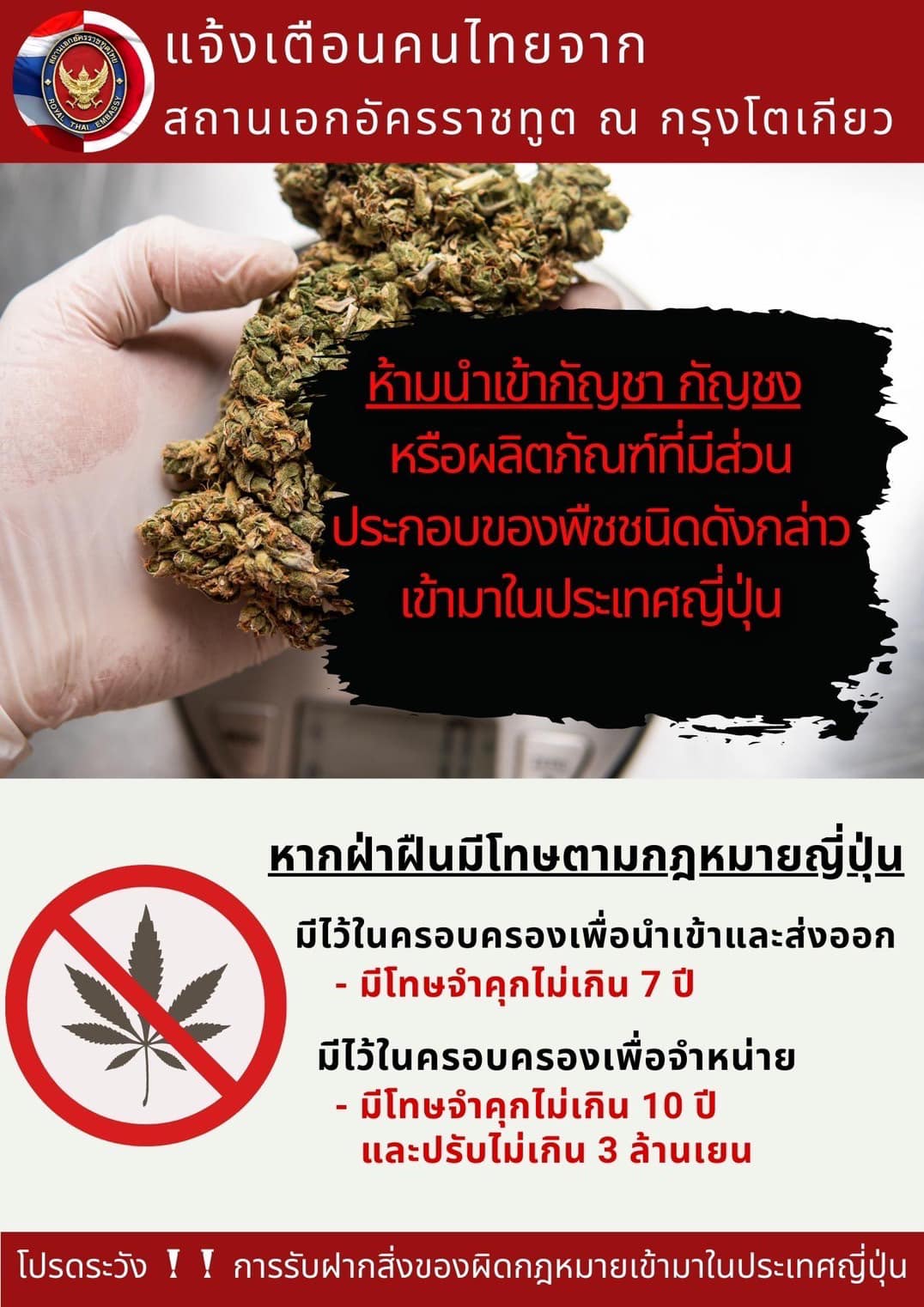 สถานเอกอัครราชทูต ณ กรุงโตเกียว ขอแจ้งเตือนคนไทย ห้ามนำเข้ากัญชา กัญชง หรือผลิตภัณฑ์ที่มีส่วนประกอบของพืชชนิดดังกล่าว เข้ามาในประเทศญี่ปุ่น หากฝ่าฝืน มีโทษตามกฎหมายญี่ปุ่น