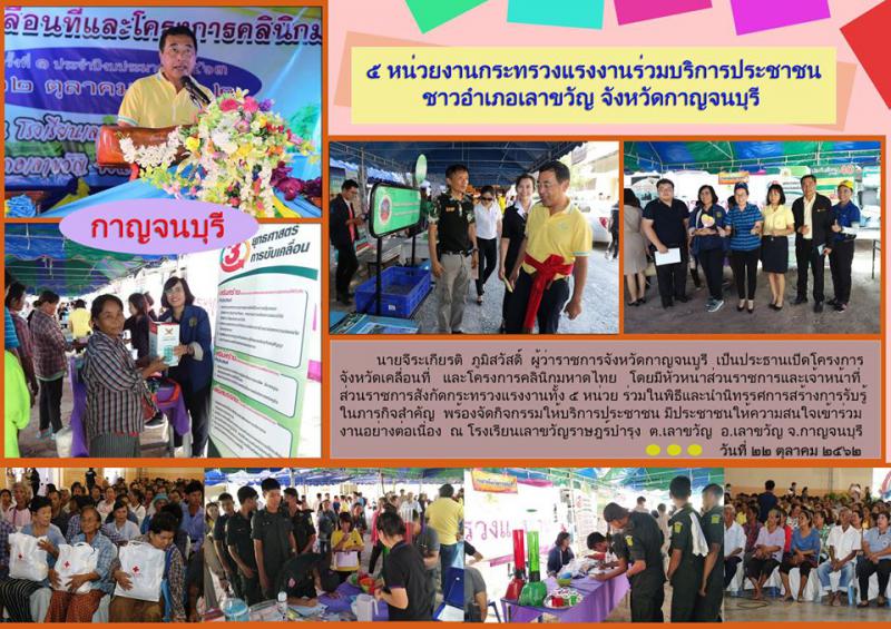 กระทรวงแรงงานจังหวัดกาญจนบุรีออกหน่วยบริการพี่น้องชาวอำเภอเลาขวัญในวันอังคาร ที่ 22 ตุลาคม 2562 ณ โรงเรียนเลาขวัญราษฎร์บำรุง ตำบลเลาขวัญ อำเภอเลาขวัญ จังหวัดกาญจนบุรี โดยมี นายจีระเกียรติ ภูมิสวัสดิ์ ผู้ว่าราชการจังหวัดกาญจนบุรี เป็นประธานเปิดโครงการจังหวัดเคลื่อนที่ และโครงการคลินิกมหาดไทย