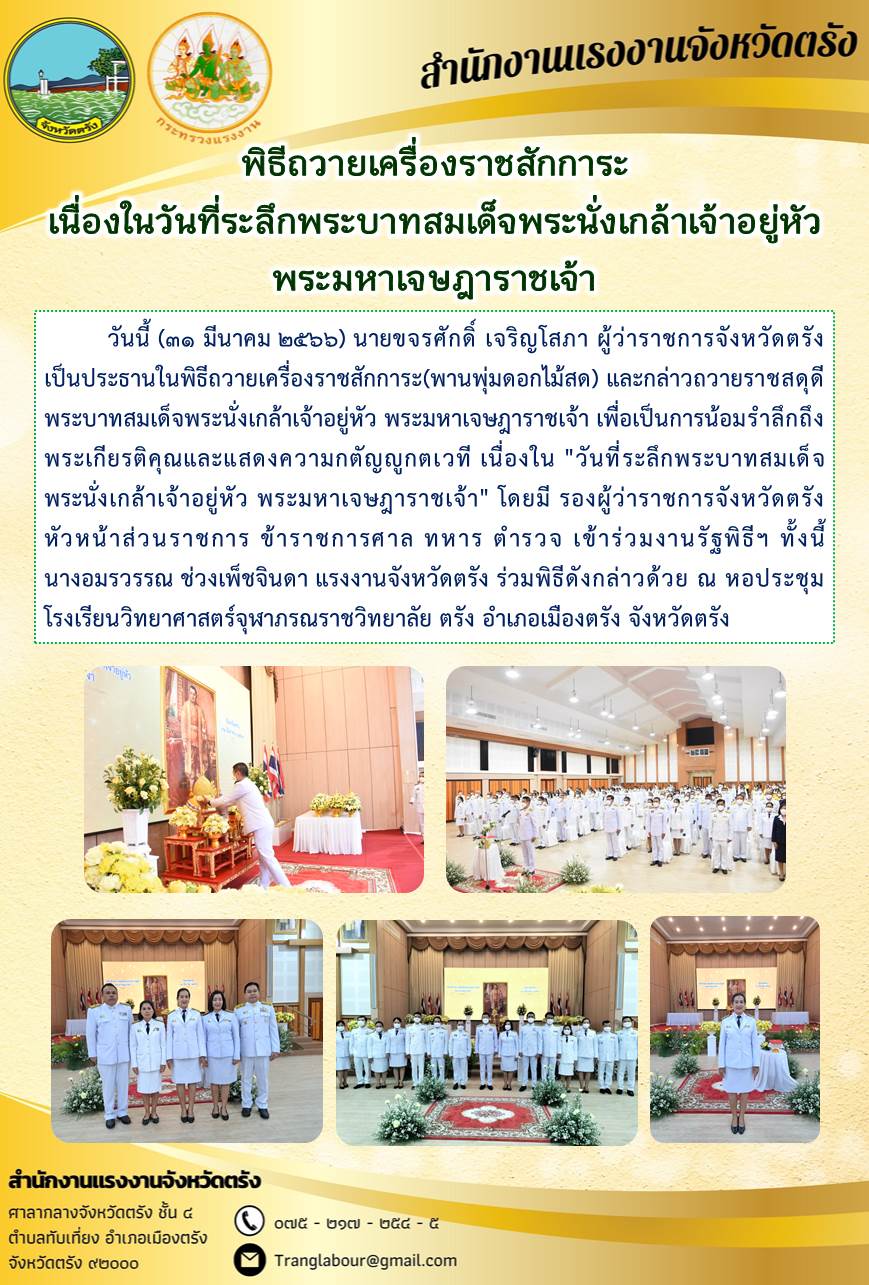 แรงงานจังหวัดตรัง ร่วมพิธีถวายเครื่องราชสักการะ เนื่องในวันที่ระลึกพระบาทสมเด็จพระนั่งเกล้าเจ้าอยู่หัว พระมหาเจษฎาราชเจ้า