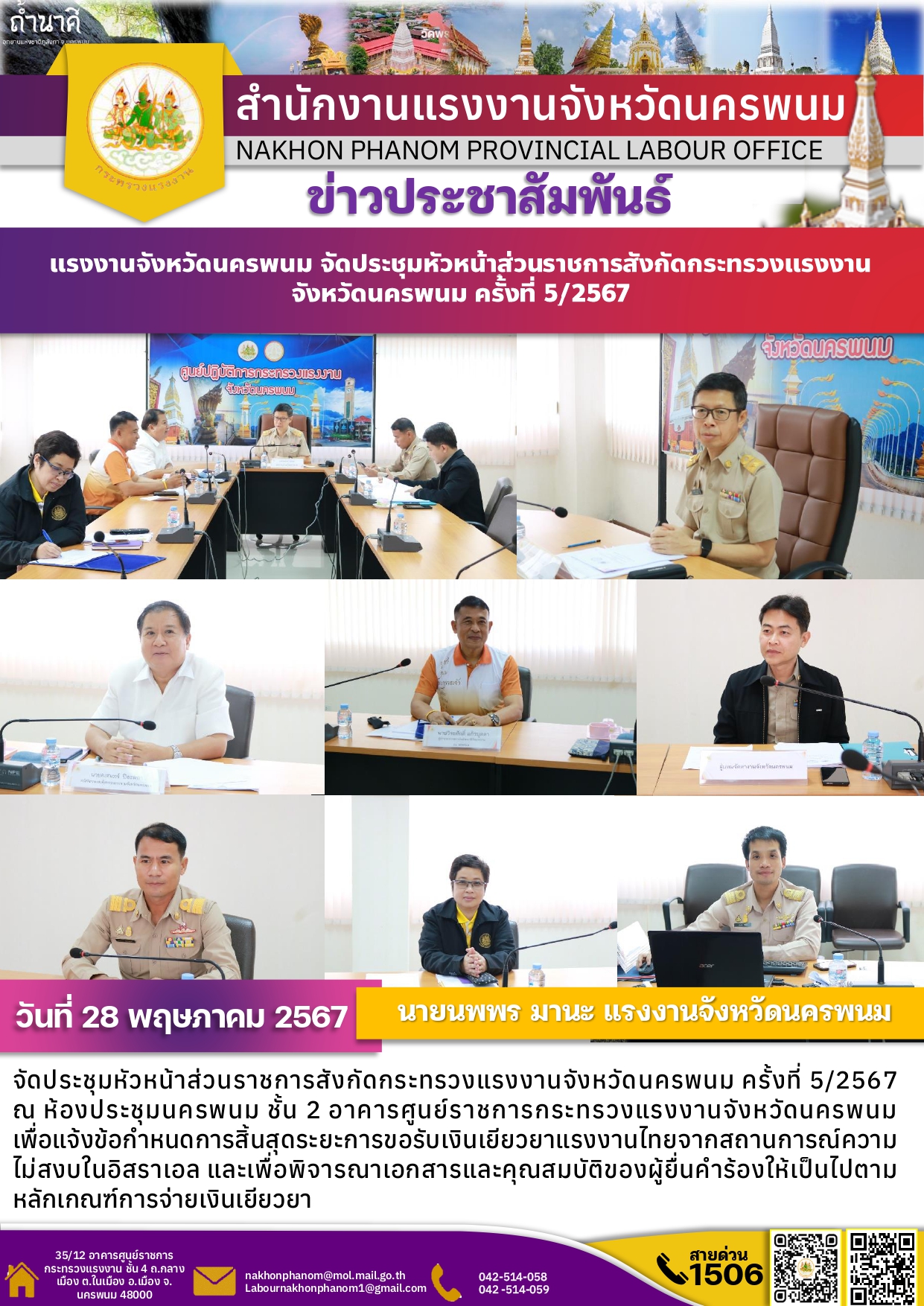 วันที่ 28 พฤษภาคม พ.ศ. 2567 นายนพพร มานะ แรงงานจังหวัดนครพนม จัดประชุมหัวหน้าส่วนราชการสังกัดกระทรวงแรงงานจังหวัดนครพนม ครั้งที่ 5/2567 ณ ห้องประชุมนครพนม ชั้น 2 อาคารศูนย์ราชการกระทรวงแรงงานจังหวัดนครพนม เพื่อแจ้งข้อกำหนดการสิ้นสุดระยะการขอรับเงินเยียวยาแรงงานไทยจากสถานการณ์ความไม่สงบในอิสราเอล และเพื่อพิจารณาเอกสารและคุณสมบัติของผู้ยื่นคำร้องให้เป็นไปตามหลักเกณฑ์การจ่ายเงินเยียวยา