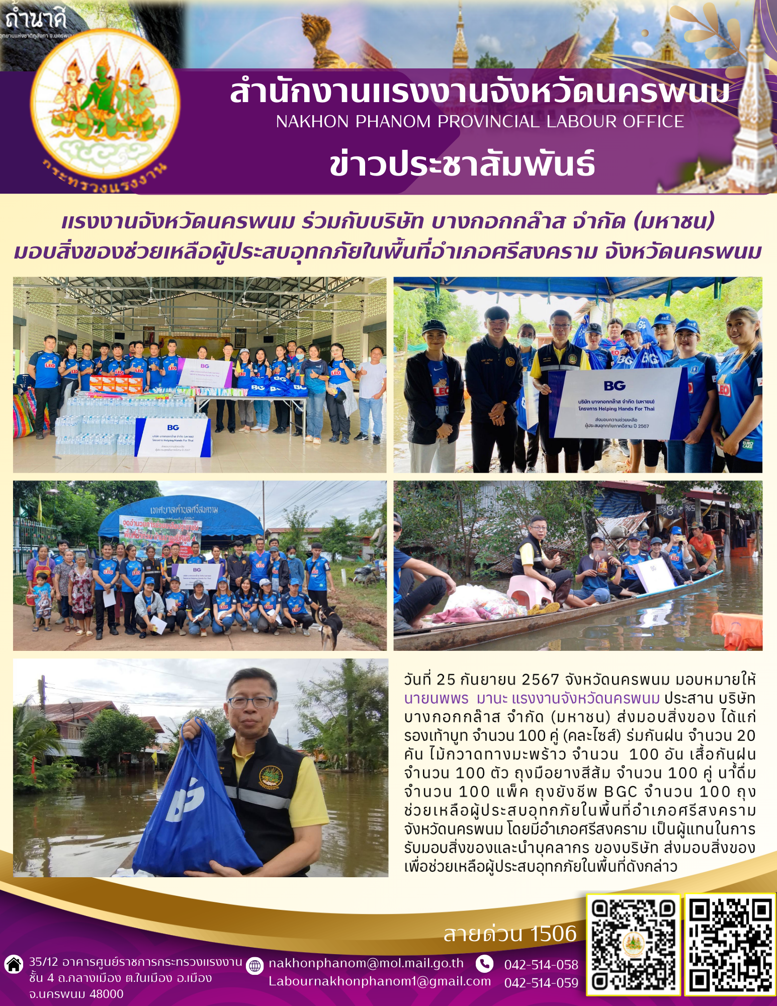 วันที่ 25 กันยายน 2567 จังหวัดนครพนม มอบหมายให้ นายนพพร มานะ แรงงานจังหวัดนครพนม ประสาน บริษัท บางกอกกล๊าส จำกัด (มหาชน) ส่งมอบสิ่งของ ได้แก่ รองเท้าบูท จำนวน 100 คู่ (คละไซส์) ร่มกันฝน จำนวน 20 คัน ไม้กวาดทางมะพร้าว จำนวน 100 อัน เสื้อกันฝน จำนวน 100 ตัว ถุงมือยางสีส้ม จำนวน 100 คู่ น้ำดื่ม จำนวน 100 แพ็ค ถุงยังชีพ BGC จำนวน 100 ถุง ช่วยเหลือผู้ประสบอุทกภัยในพื้นที่อำเภอศรีสงคราม จังหวัดนครพนม โดยมีอำเภอศรีสงคราม เป็นผู้แทนในการรับมอบสิ่งของและนำบุคลากร ของบริษัท ส่งมอบสิ่งของเพื่อช่วยเหลือผู้ประสบอุทกภัยในพื้นที่ดังกล่าว