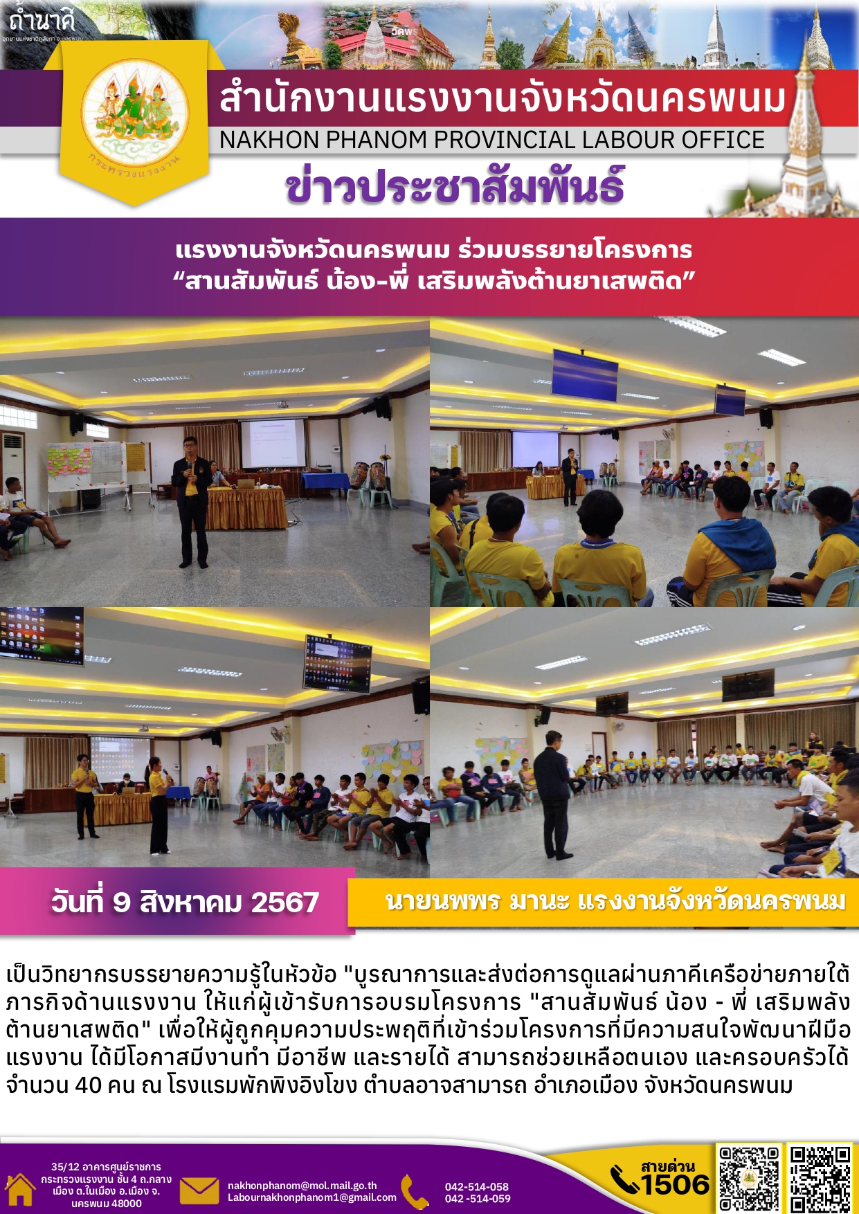 วันที่ 9 สิงหาคม 2567 นายนพพร มานะ แรงงานจังหวัดนครพนม เป็นวิทยากรบรรยายความรู้ในหัวข้อ “บูรณาการและส่งต่อการดูแลผ่านภาคีเครือข่ายภายใต้ภารกิจด้านแรงงาน ให้แก่ผู้เข้ารับการอบรมโครงการ “สานสัมพันธ์ น้อง – พี่ เสริมพลังต้านยาเสพติด” เพื่อให้ผู้ถูกคุมความประพฤติที่เข้าร่วมโครงการที่มีความสนใจพัฒนาฝีมือแรงงาน ได้มีโอกาสมีงานทำ มีอาชีพ และรายได้ สามารถช่วยเหลือตนเอง และครอบครัวได้จำนวน 40 คน ณ โรงแรมพักพิงอิงโขง ตำบลอาจสามารถ อำเภอเมือง จังหวัดนครพนม